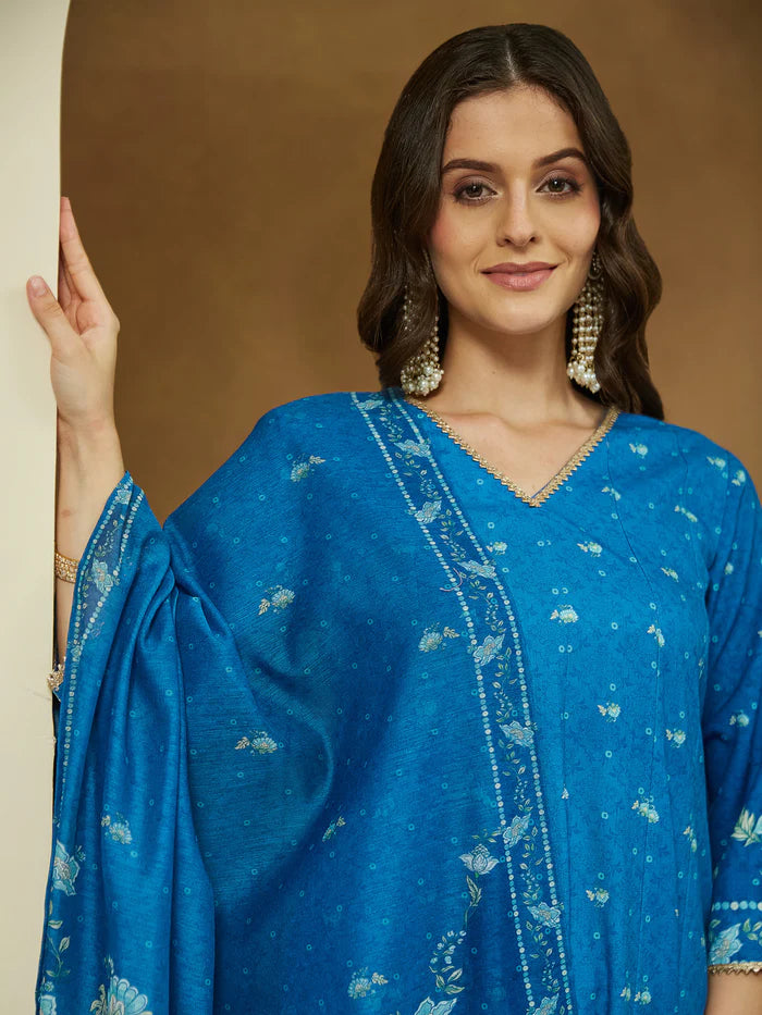This blue cotton blend anarkali suit features bandhani and floral prints with a graceful v-neckline and three-quarter sleeves detailed with gota patti lace. The matching straight pants have a semi-elastic waist for comfort, paired with a soft chanderi dupatta. Ideal for festive occasions, it blends traditional design with modern style.