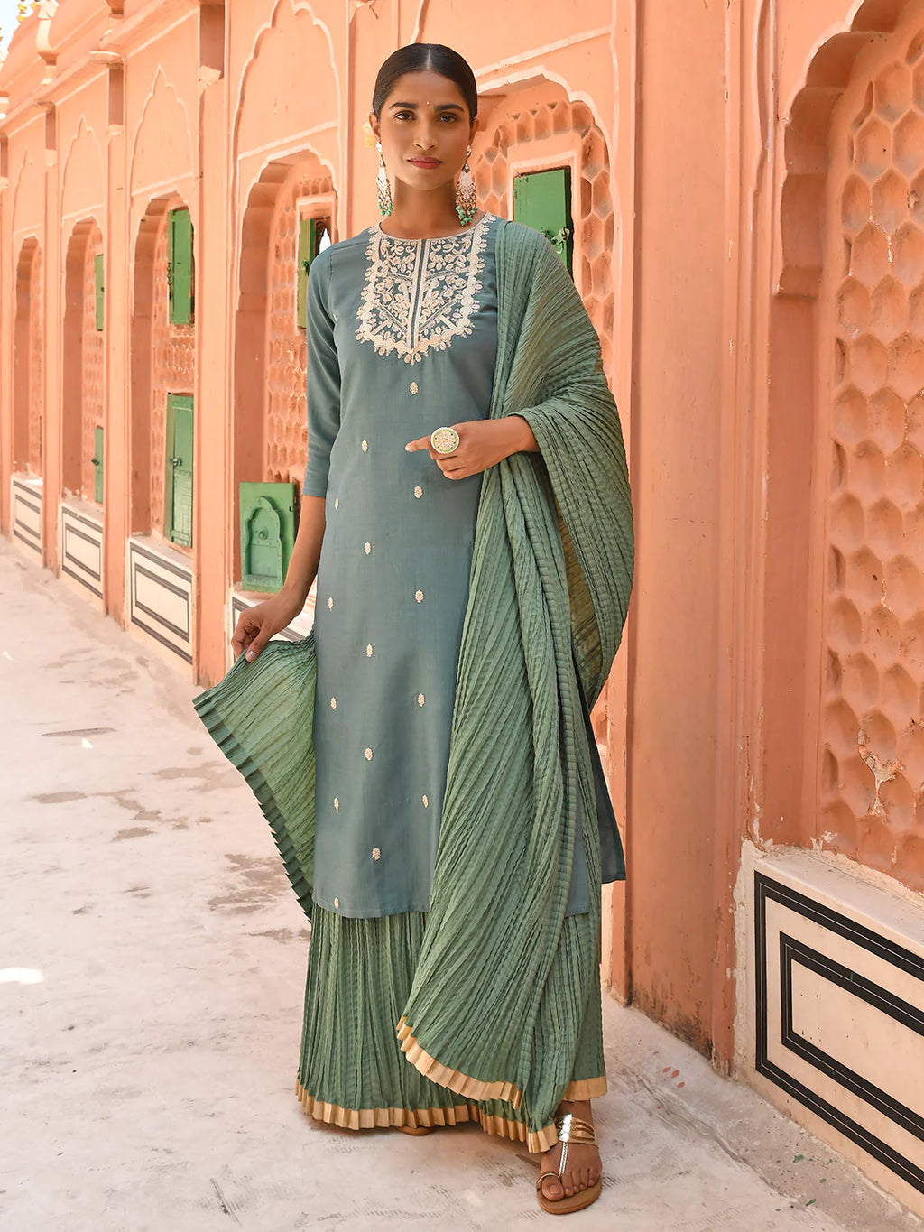 Dark Green Rayon Embellished Foil Print A-Line Sharara Set with Chiffon Dupatta