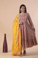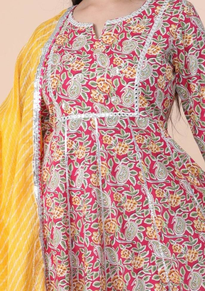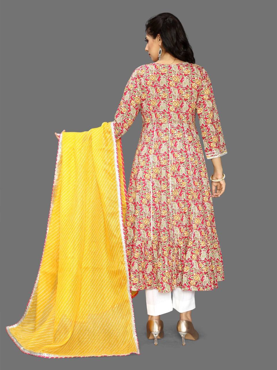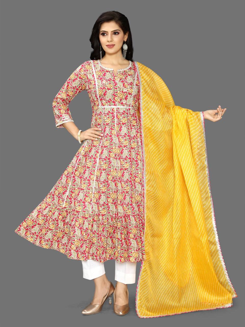 This is a stunning 3 piece anarkali set. The kurta comes with a print, gotta patti detailing, zari & embroidery work, round neck, 3/4th sleeves, flared.The set also comes with a printed palazzo pants and a dupatta to match.The entire set has beautiful silver lace detailing