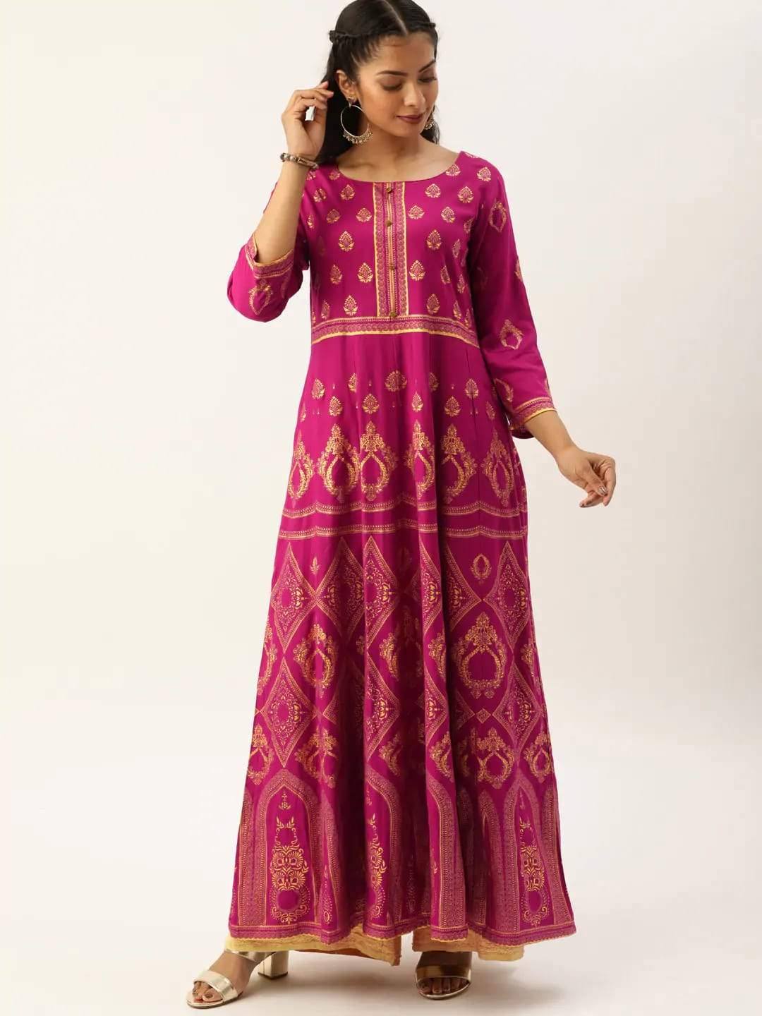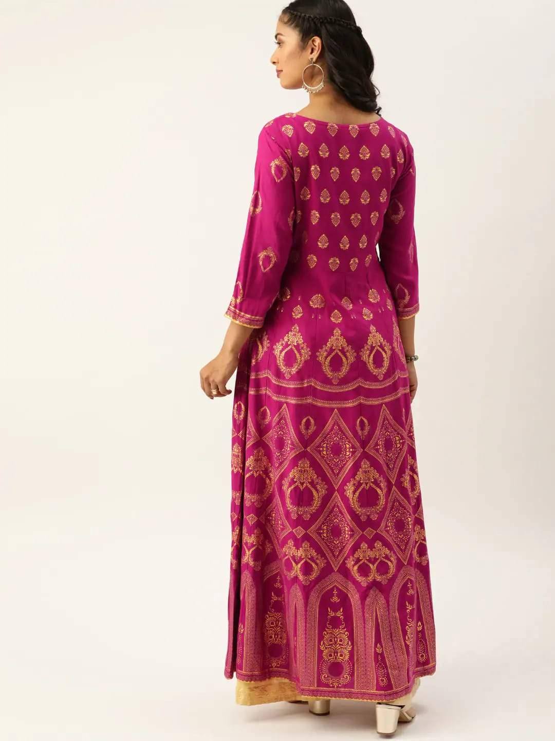 Magenta Pink & Gold-Toned Printed Anarkali Kurta | Kurtis online USA – Ria Fashions