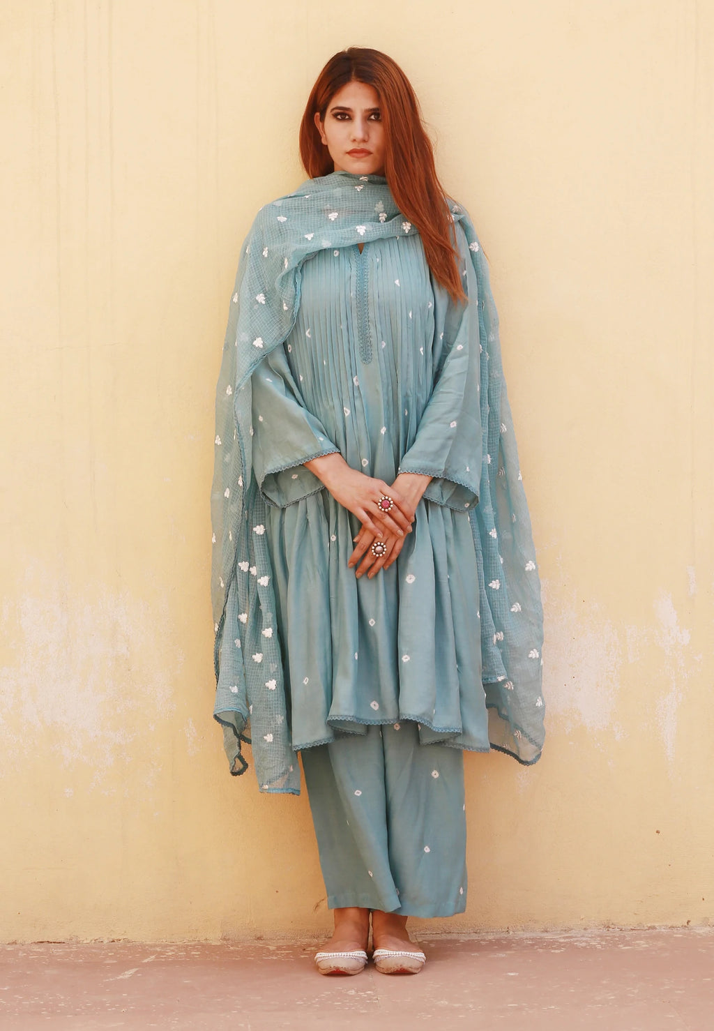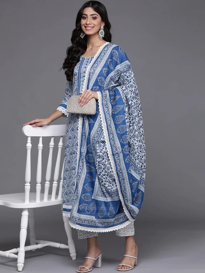 Cotton Grey Printed Kurta Pant Set with Mulmul Dupatta