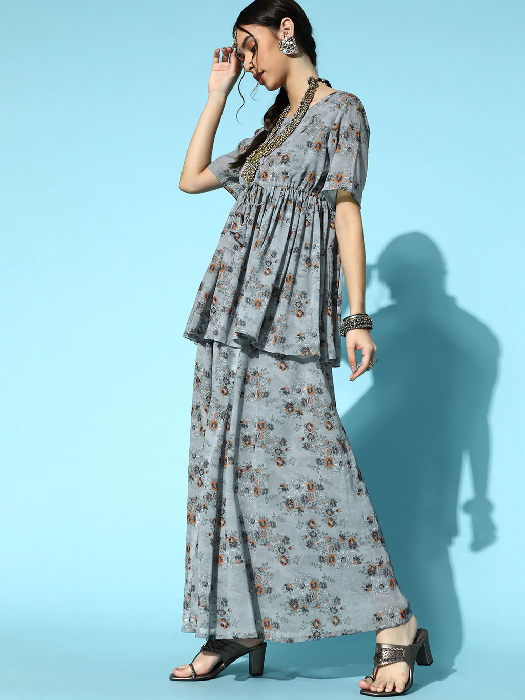 Grey & Peach Silk Chiffon Floral Print A Line Dress with Belt