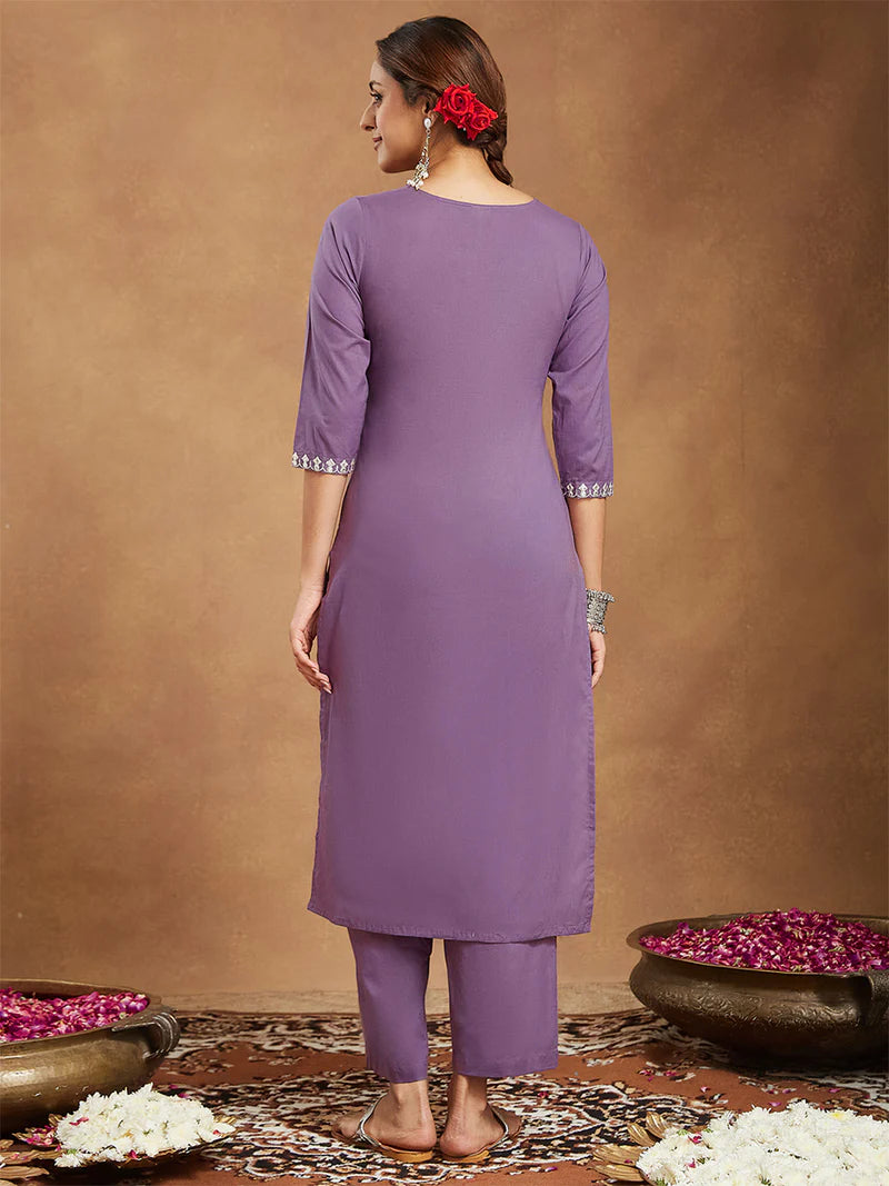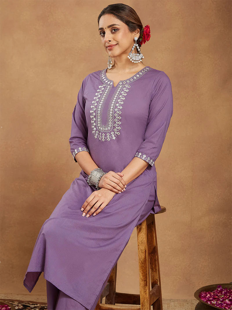 This lavender cotton kurta set combines comfort with elegant style. The straight kurta features silver zari and mirror embroidery on the neckline and three-quarter sleeves, while soft pure cotton keeps you cool all day. Paired with coordinating lavender pants that include a practical pocket and comfortable waistband, this set is perfect for both celebrations and everyday wear.