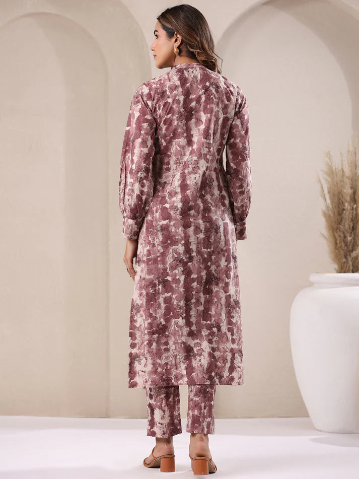 Mauve cotton tie-dye kurta set with artistic beige and wine tones throughout. The kurta showcases a band collar, floral prints, cuffed sleeves, and button-keyhole closure for added detail. Paired with matching narrow pants featuring a convenient side pocket. A unique, eye-catching choice that blends artisanal charm with everyday wearability.