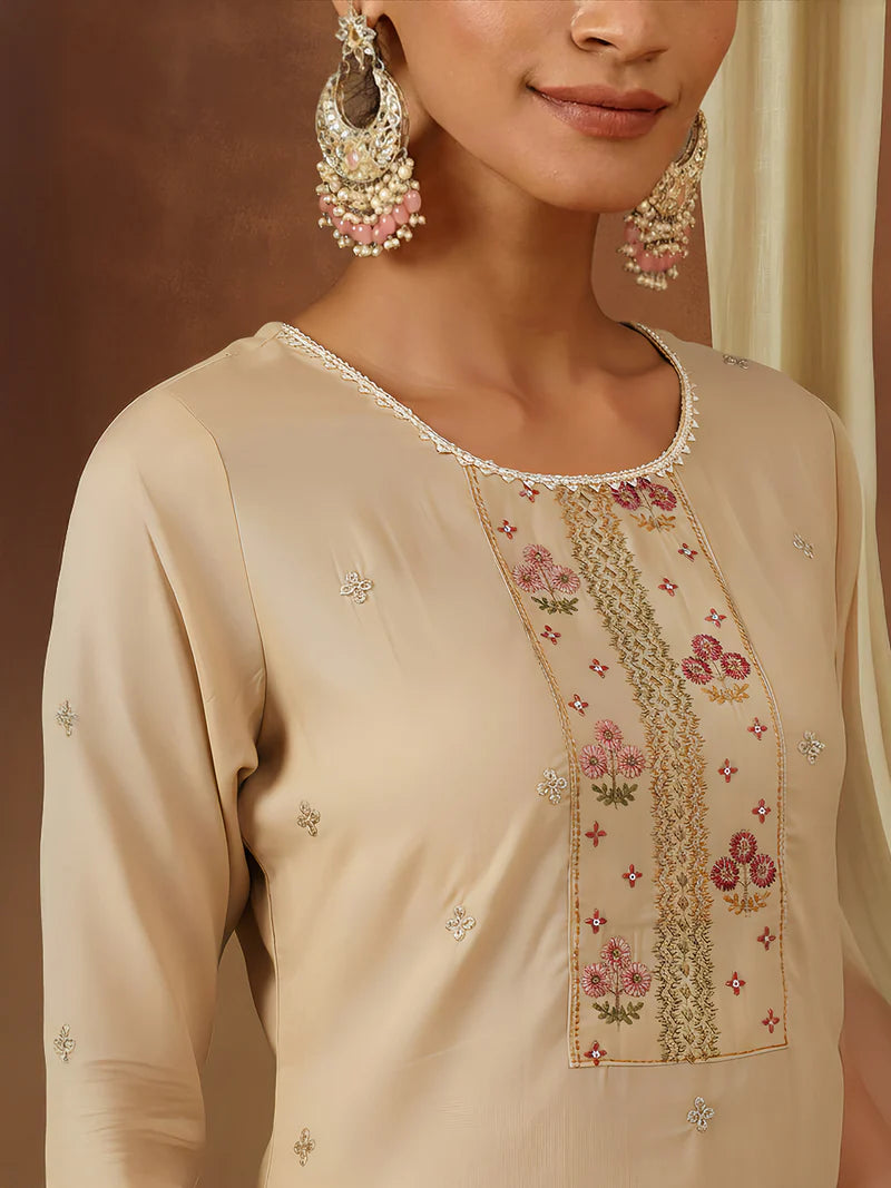 Elegant beige chanderi silk kurta set with ornate yoke embroidery, gold zari florals, and sequin accents. Features lace-trimmed neckline and three-quarter sleeves paired with matching straight pants. Ideal for festive occasions.