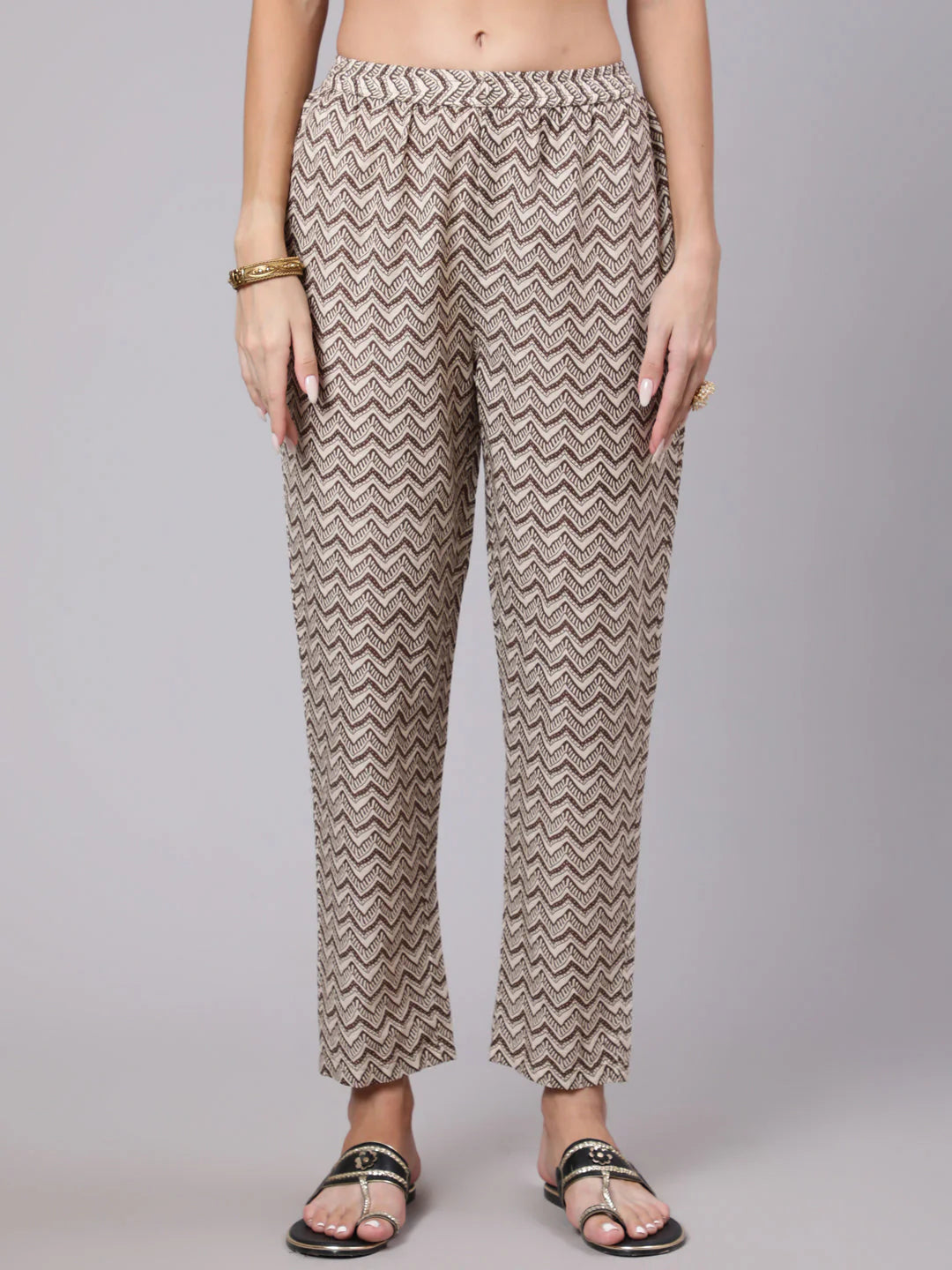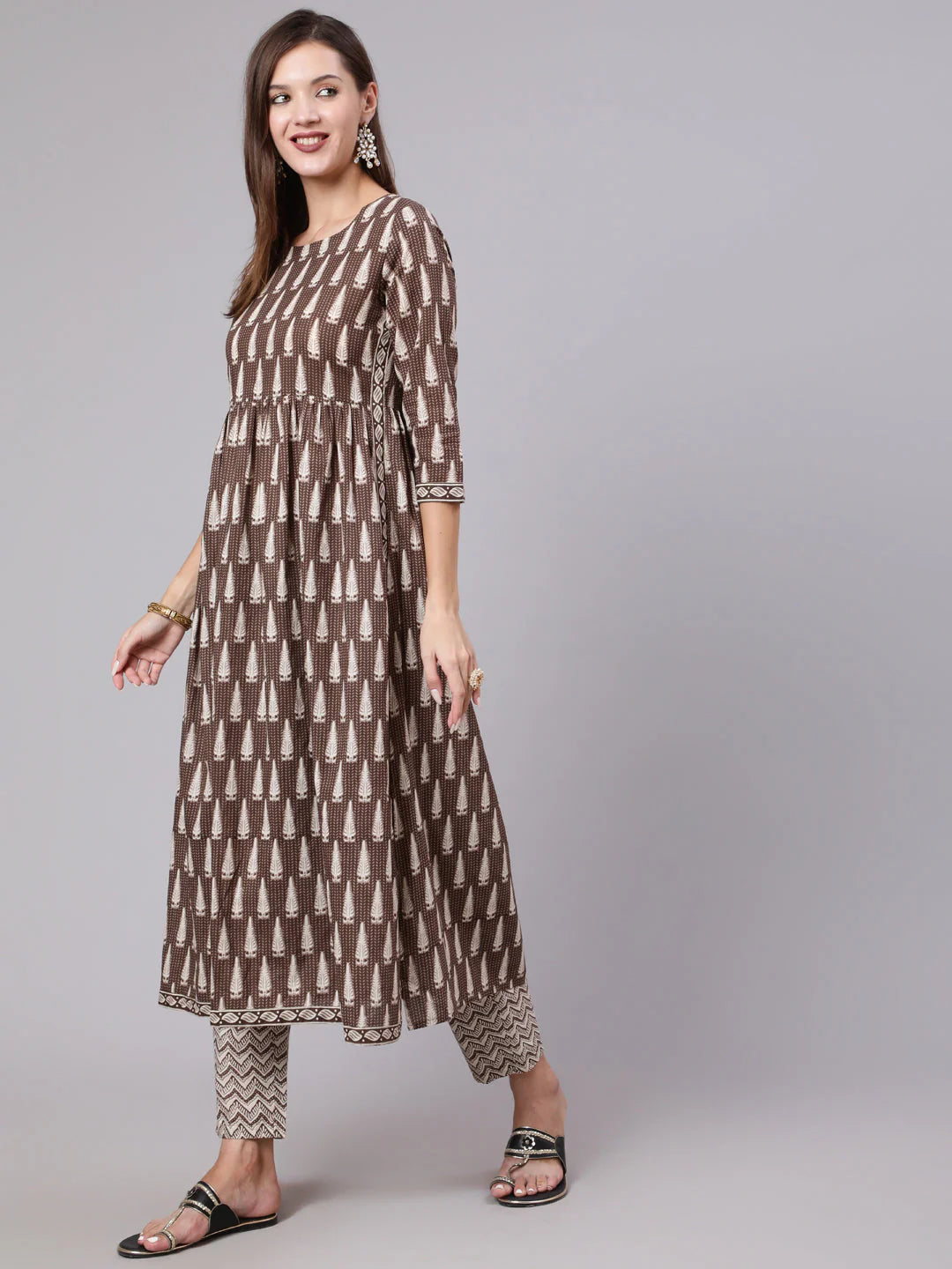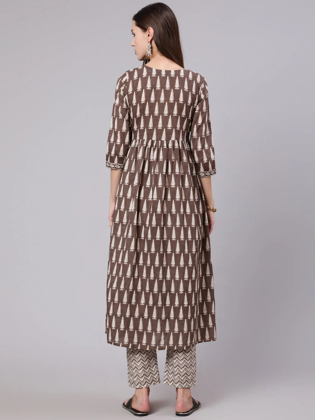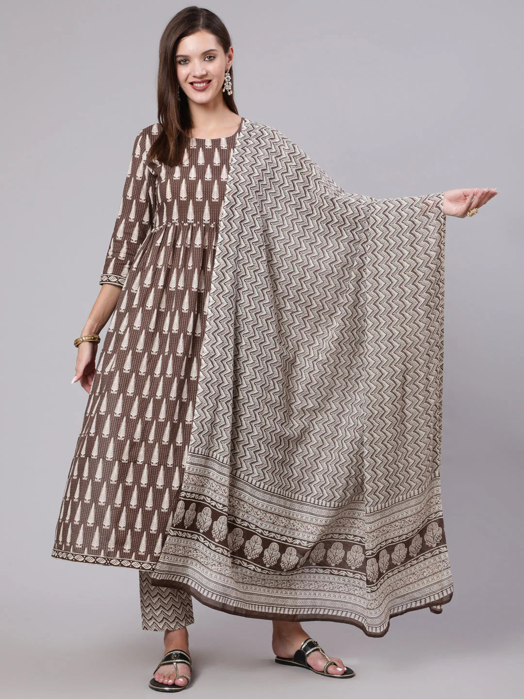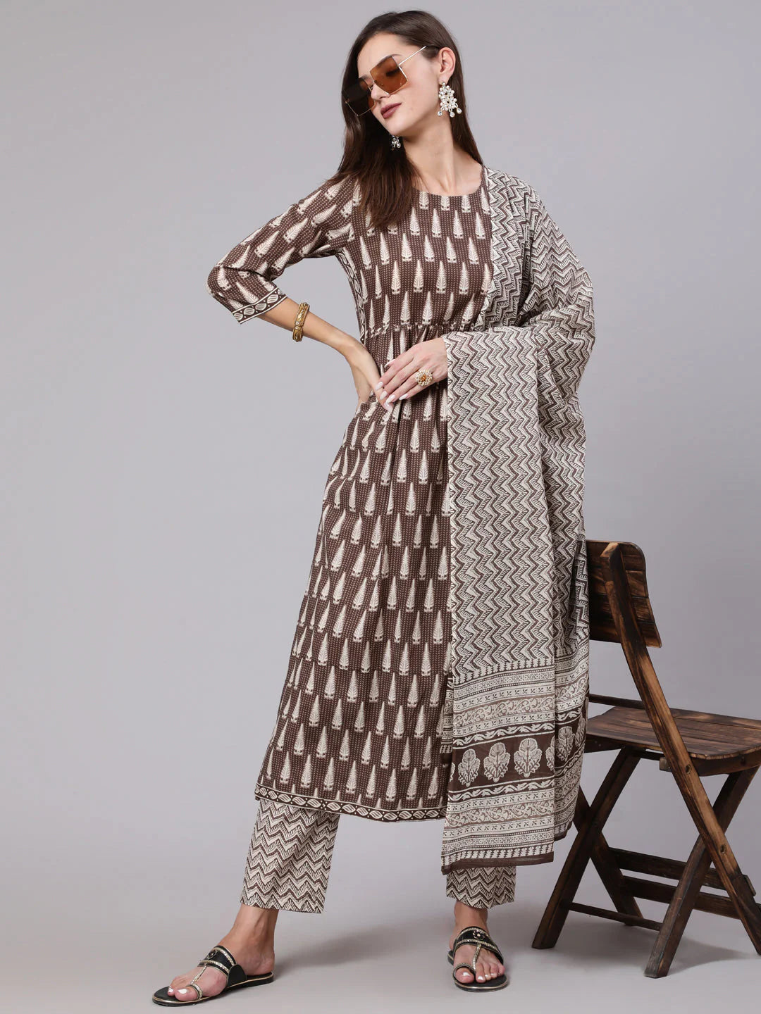 This Brown Pure Cotton Printed A Line Suit Set with Dupatta showcases a chic kurta adorned with intricate prints, finished with 3/4 sleeves and a round neckline. The ensemble includes soft, solid-colored trousers and a coordinating dupatta, offering both elegance and comfort. Ideal for elevating your traditional wardrobe while ensuring ease throughout the day.