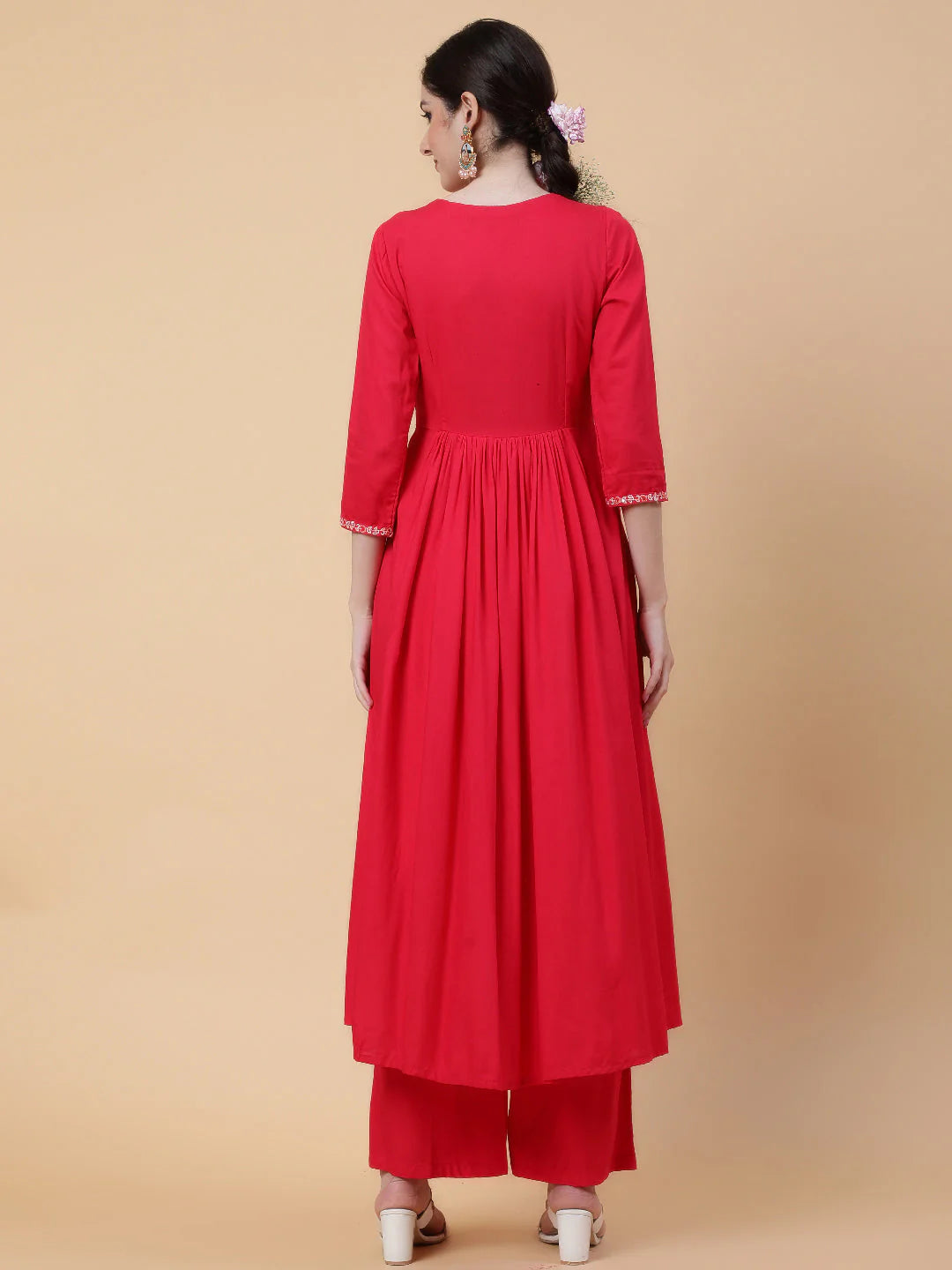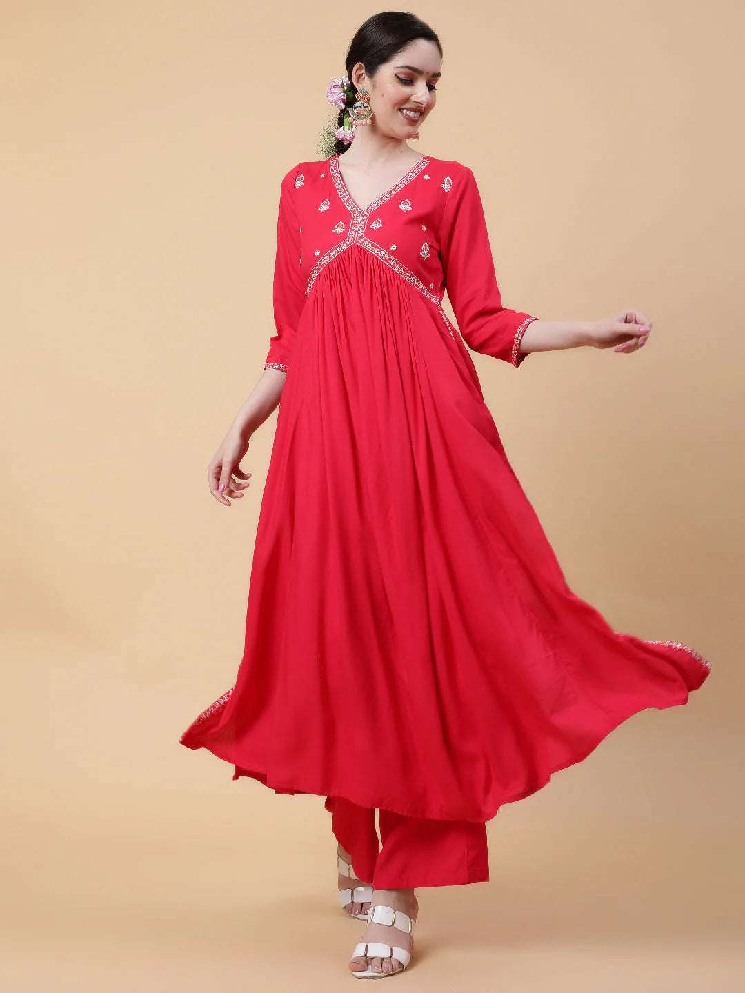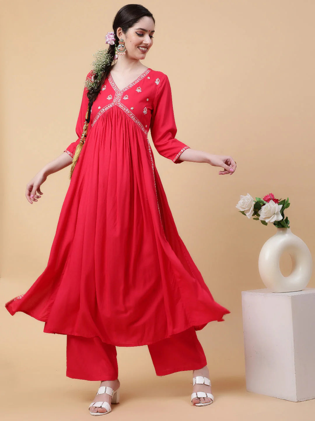 The Coral Solid Viscose Rayon Embroidered Kurta Bottom Set showcases an elegant kurta adorned with intricate embroidery, featuring flattering 3/4 sleeves and a classic V-neck. Matched with simple solid trousers, this ensemble combines sophistication with comfort. Ideal for enhancing your ethnic wardrobe, it offers a polished style you can confidently wear throughout the day.