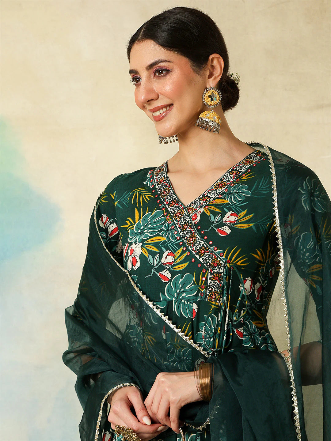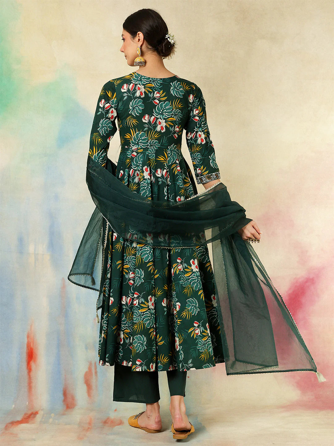 This elegant set includes a printed Anarkali kurta with 3/4 sleeves and a V-neck, paired with solid trousers and a dupatta featuring a tapping border. Perfect for a stylish, comfortable look.