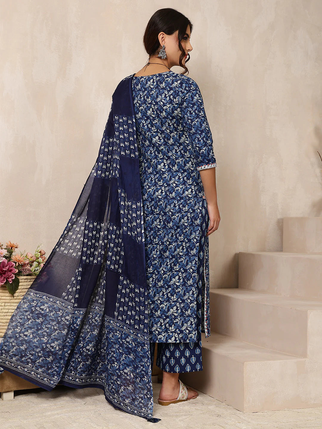This Indigo Cotton Printed & Embroidered Suit Set with Dupatta features a graceful print and subtle embroidery around the neckline. The kurta includes a flattering V-neck and three-quarter sleeves, paired with coordinating trousers and a stylish dupatta. Combining comfort with refined style, this set is ideal for making a stunning impression at any special occasion.