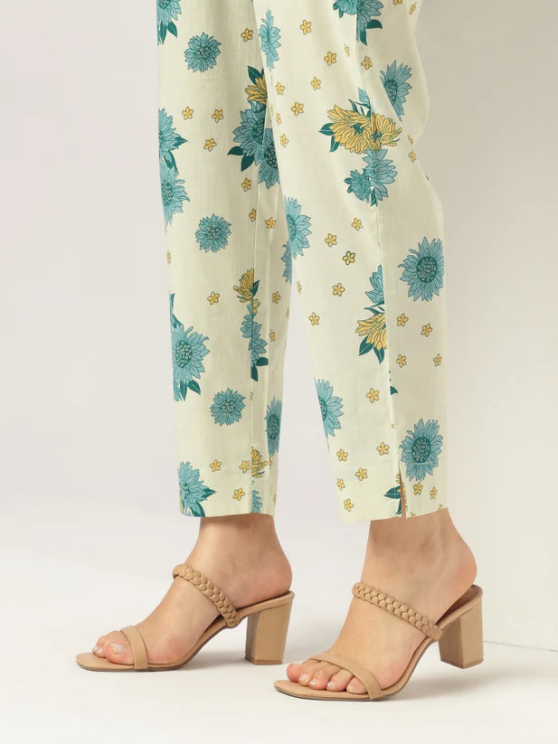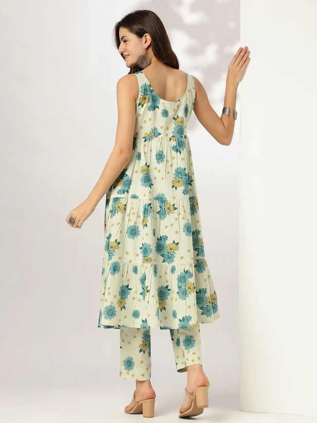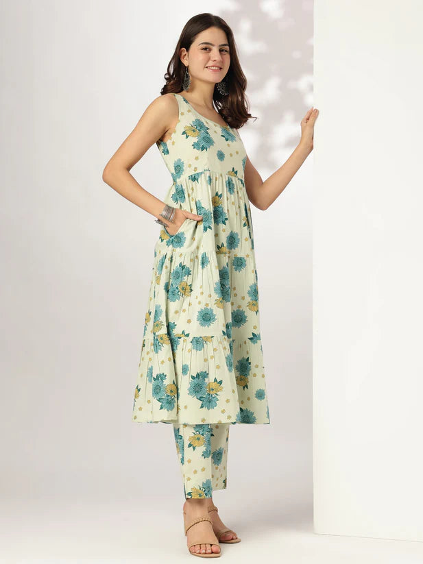 This mint green pure cotton kurta set features a floral print and a tiered, sleeveless design with a scoop neck and side pocket. Paired with matching narrow pants, it offers a stylish and comfortable look perfect for making a chic statement.
