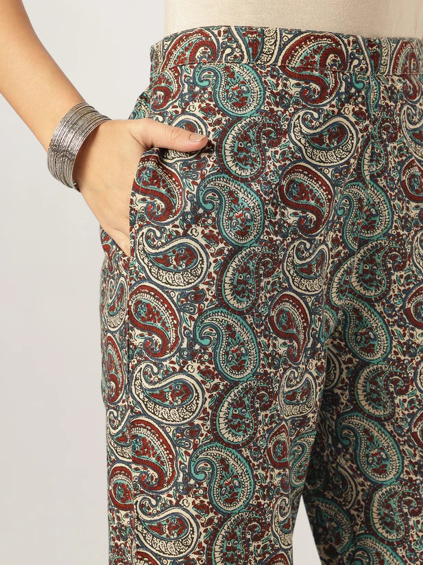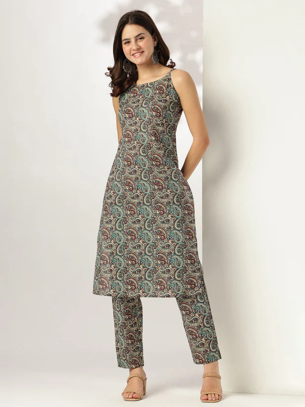 This multicolored pure cotton kurta set features delicate paisley prints and a unique scoop neck with adjustable straps for a comfortable fit. Made from breathable cotton, it includes matching bottoms with a side pocket, perfect for casual outings and keeping you cool all day.