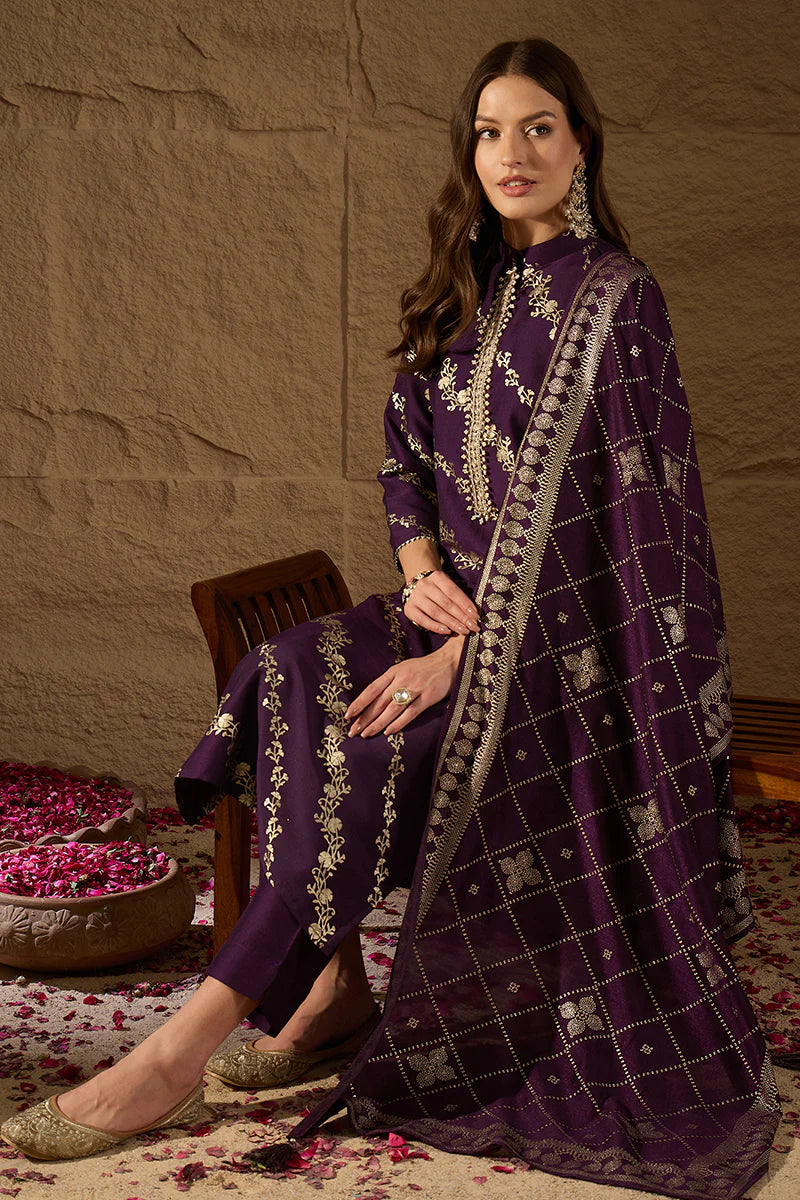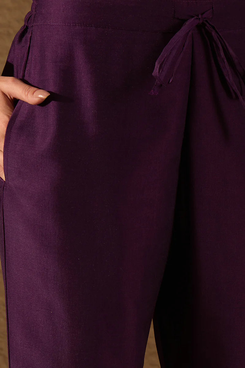 This purple silk blend suit set features a straight kurta with foil print and embroidery, 3/4 sleeves, and a collared neck. Paired with comfortable trousers and a matching dupatta, it offers an elegant and effortless style.