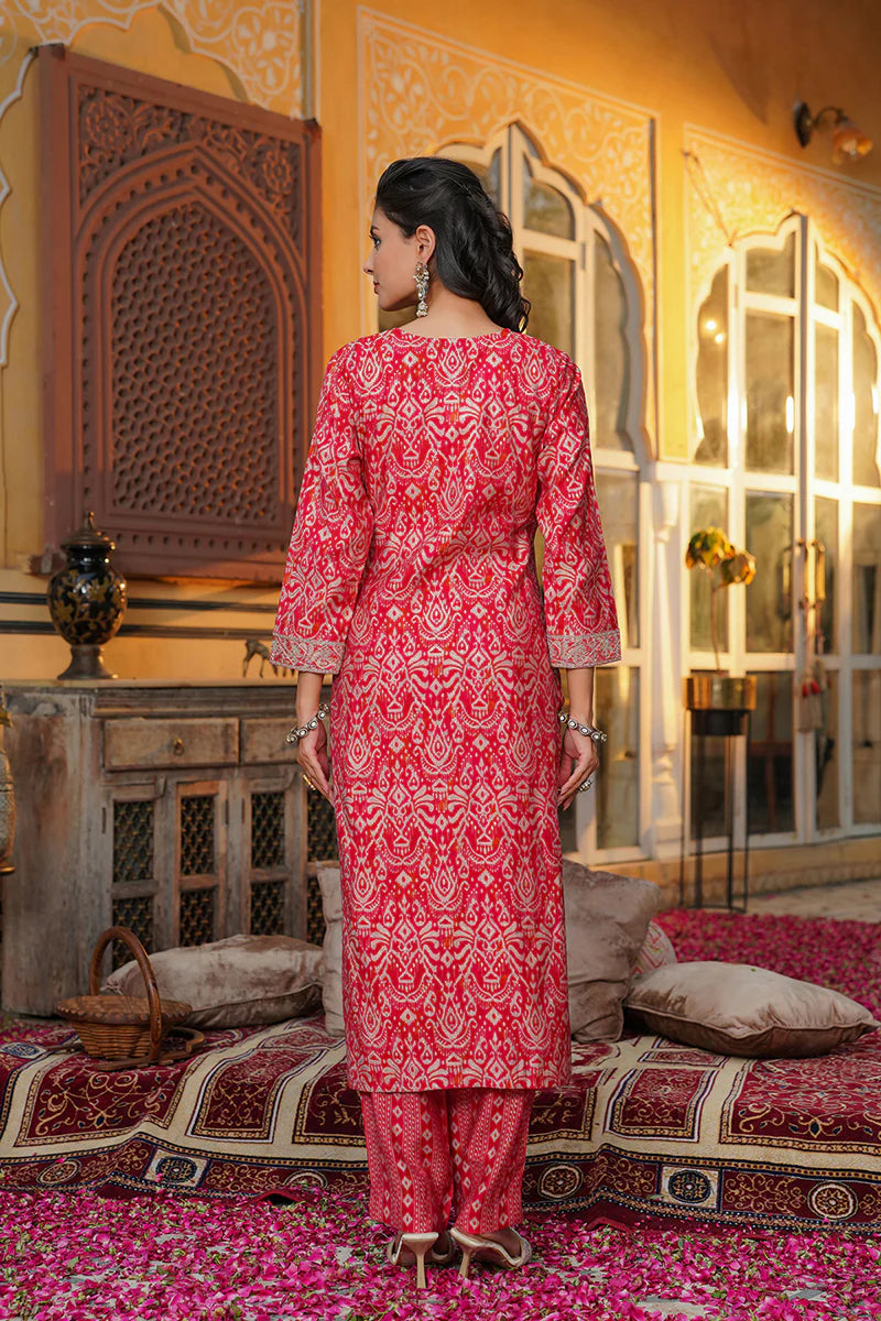 This Red Silk Blend suit set features a straight kurta with ikat ethnic motifs, paired with comfortable trousers and a matching dupatta. Made from soft, breathable fabric, it’s ideal for casual events or festive occasions, combining style with comfort effortlessly.