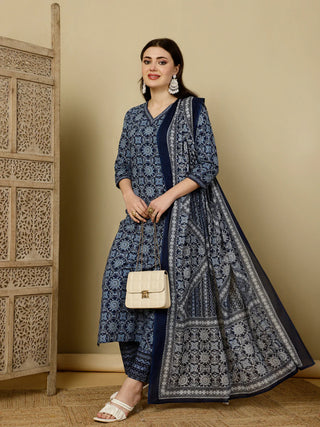 Navy Blue Viscose Rayon Floral Print Suit Set with Dupatta