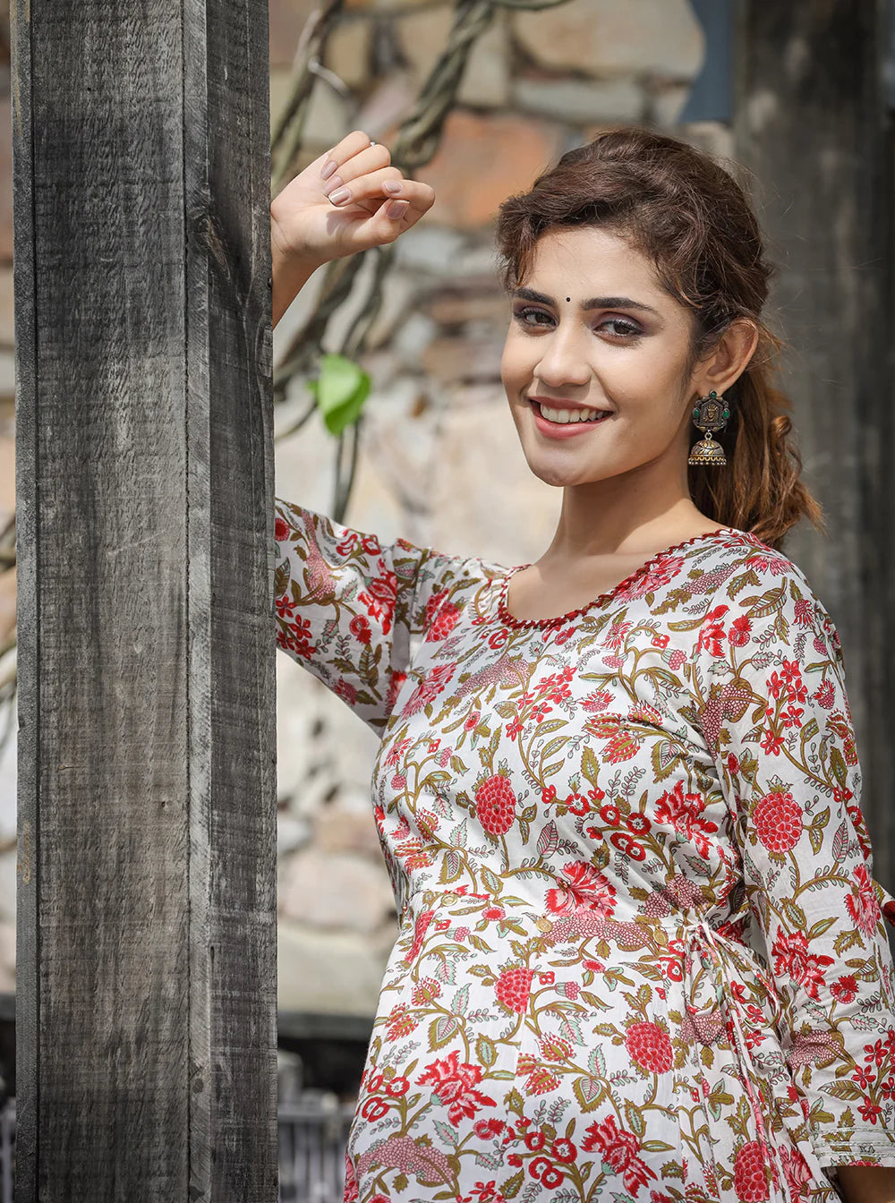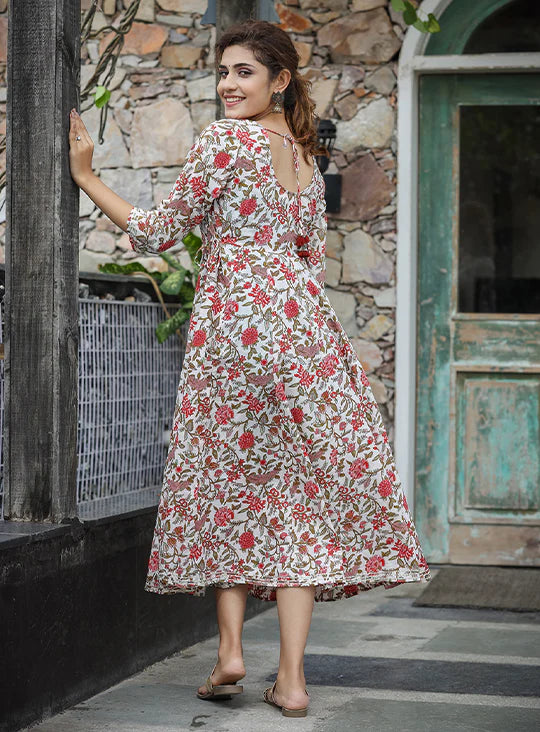 Showcase your fashion element with this White Red Floral Printed Cotton Ethnic A-line midi dress from Riafashions. It has a round neck with thread embroidery on the neckline and sequence work all over.