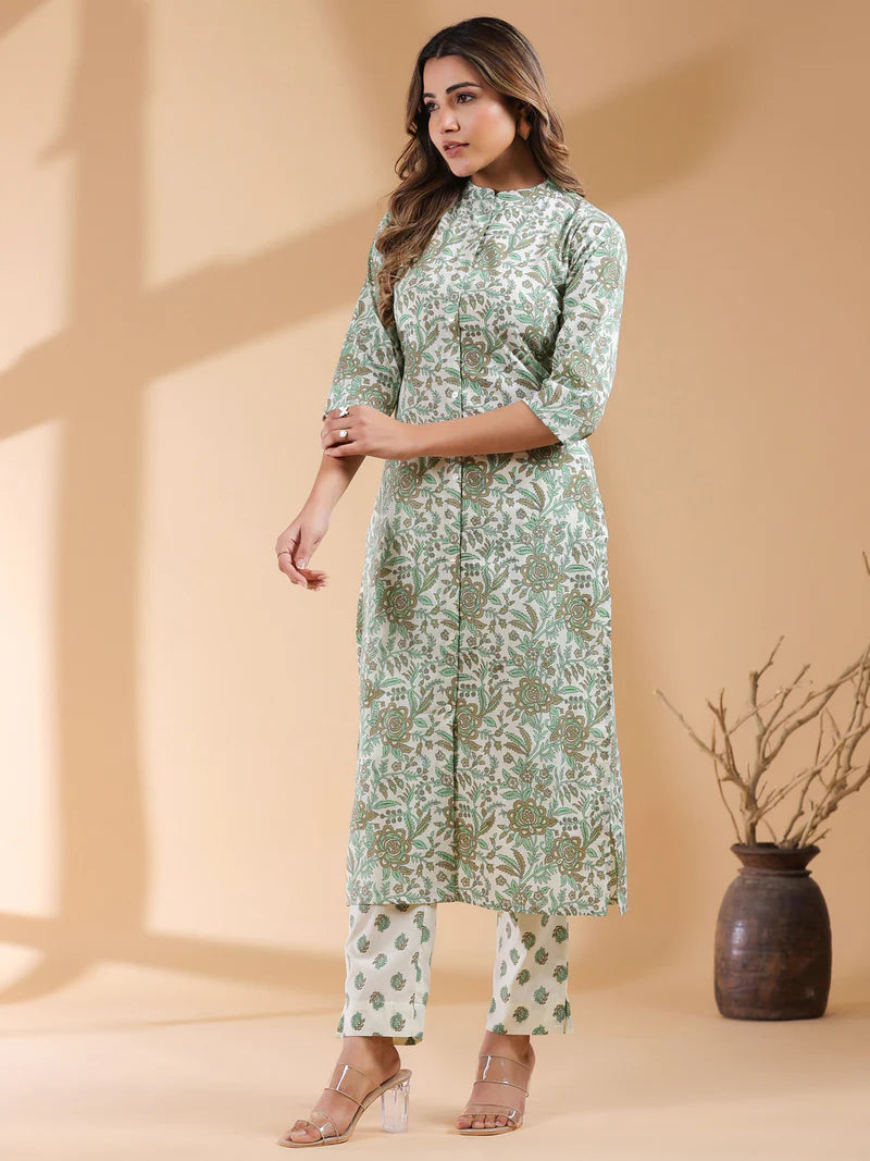 Timeless cream cotton kurta set featuring vibrant multicolored florals and a sophisticated band collar. The kurta's refined button details pair beautifully with matching narrow pants and practical side pockets. Minimal, elegant, and effortlessly stylish for any occasion.