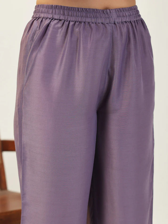 Lavender muslin a-line kurta set with elegant pleating throughout. The v-neckline features a band collar and styled button accents, while embroidered lace detailing adds sophistication. The loose fit ensures all-day comfort. Paired with straight pants featuring delicate lace hem details. A refined choice for casual evenings, easily accessorized for any occasion.