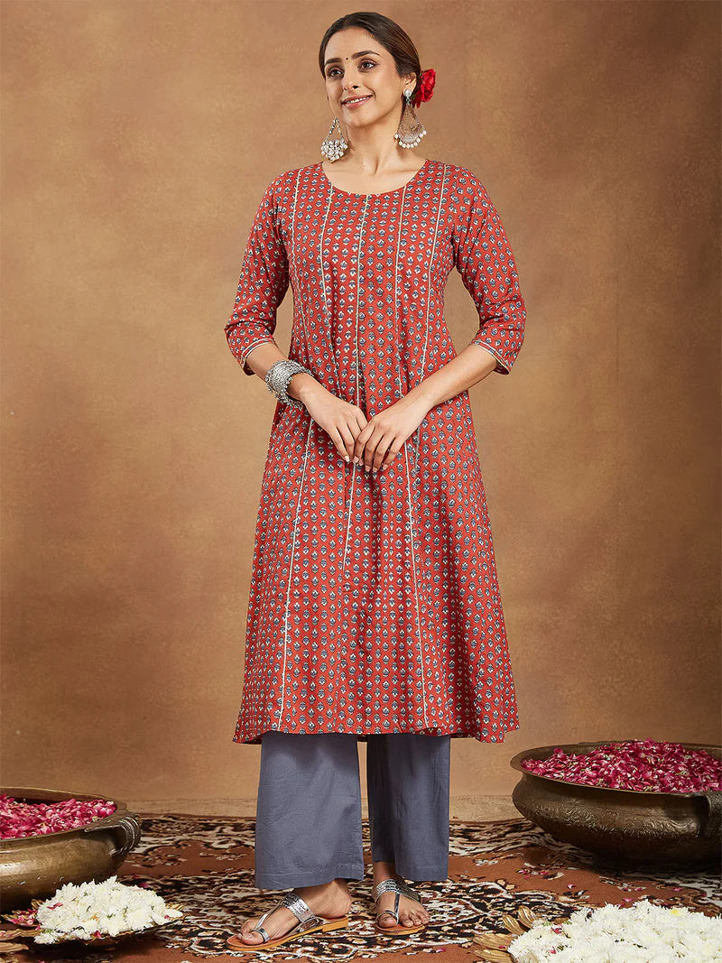 Kurta Bottom Set Online USA | Red & Grey Cotton Floral Print A Line Kurta Bottom Set – Ria Fashions