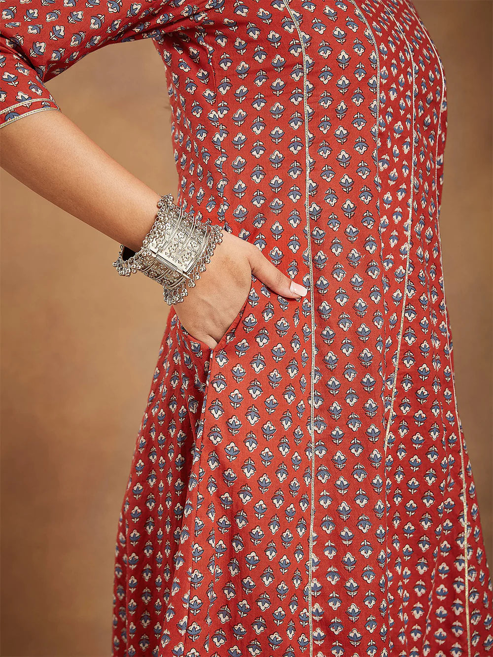 Red and grey cotton anarkali set with delicate floral prints and intricate gota lace detailing on the front panel and three-quarter sleeves. The round neckline and practical side pocket enhance both style and comfort. Paired with solid grey straight pants and a matching printed scrunchie. Ideal for casual festivities and everyday outings.