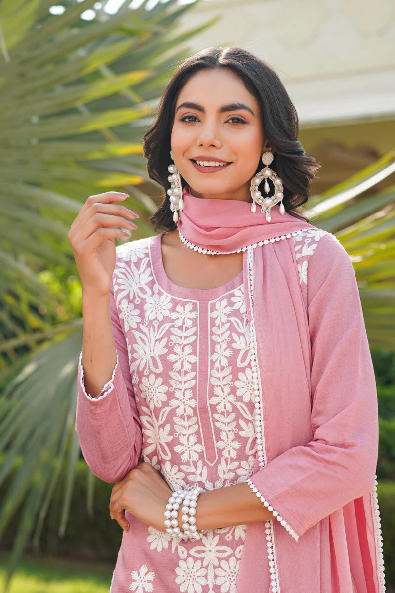 Pink Cotton Blend Floral Embroidered Suit Set with Dupatta