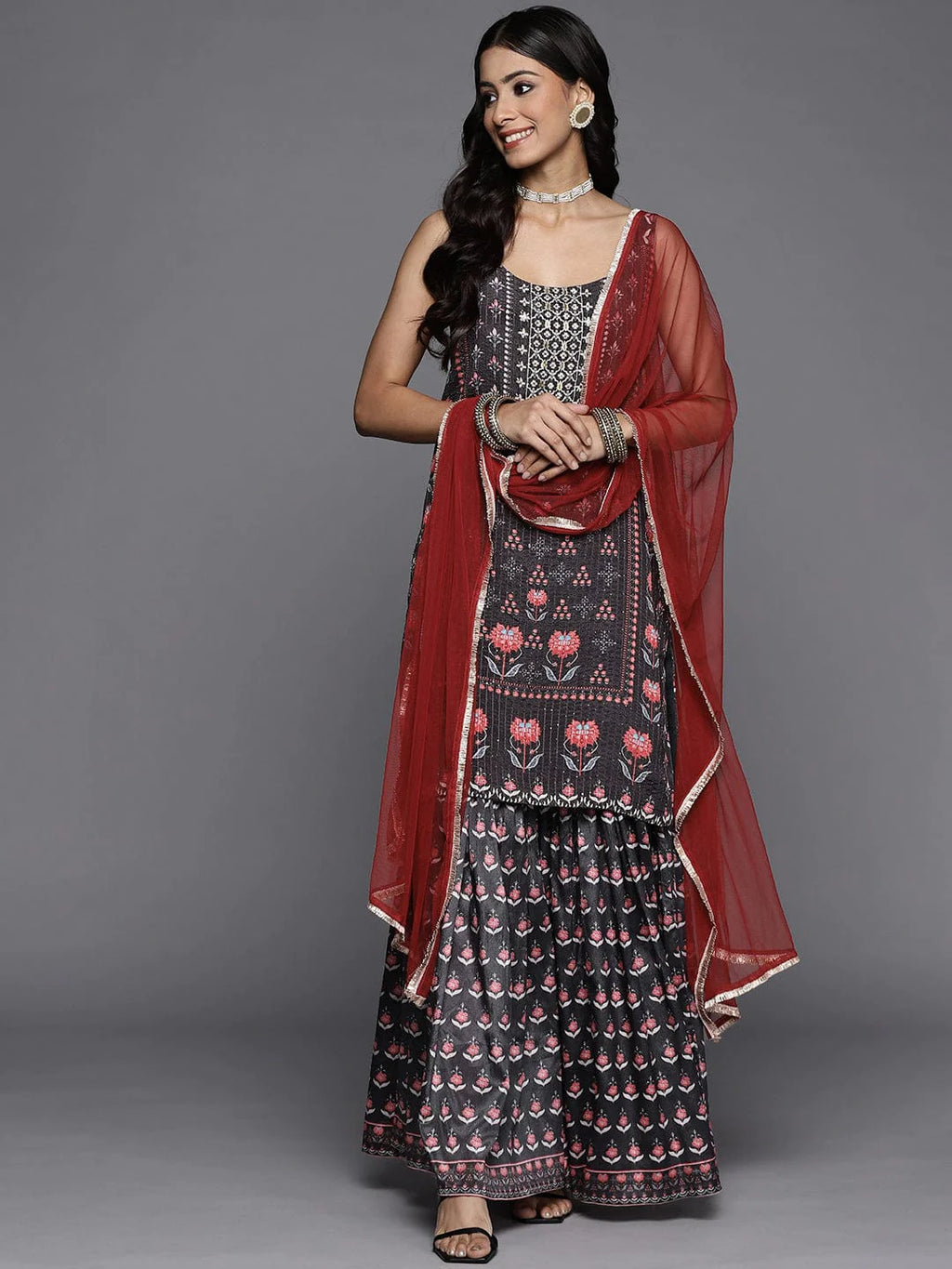Cotton Black Lace Detailing Sharara Set with Soft Net Silk Dupatta