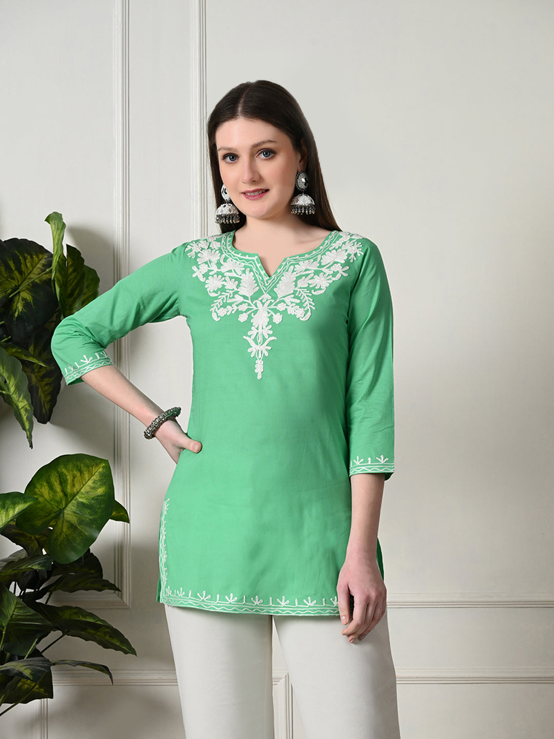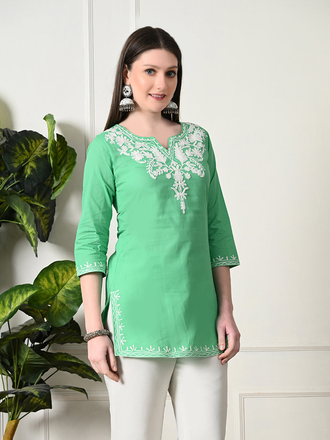 This beautiful single-piece kurta with embroidery detailing, showcases a chic round-neck, three-quarter sleeves, side slits and a trendy short length. Adorned with a graceful floral print, it’s an essential piece to elevate your wardrobe effortlessly.