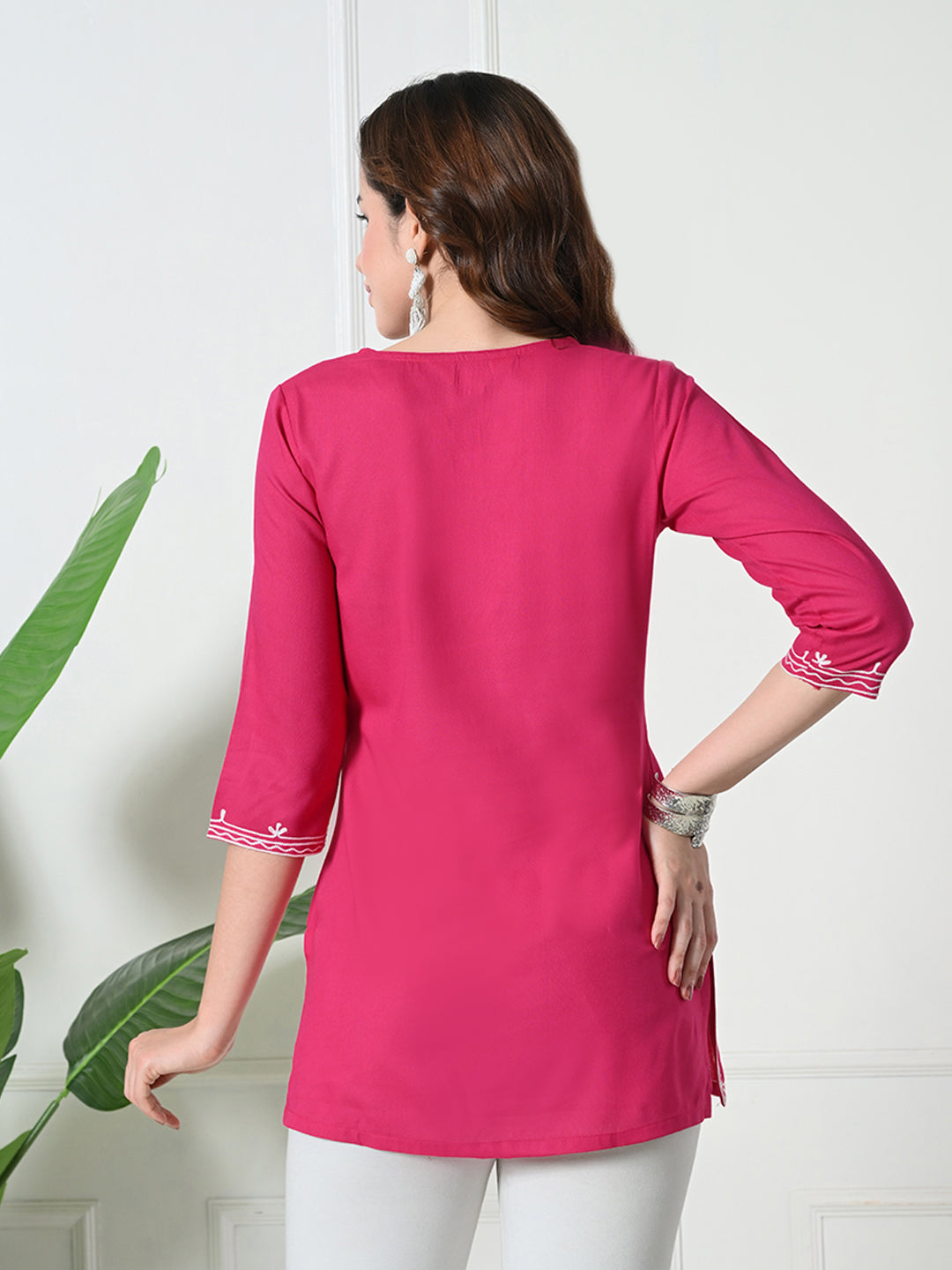 Beautiful pink rayon kurta with embroidered details, round neck, and three-quarter sleeves. Side slits offer comfort for any occasion. A flattering, versatile piece for your everyday wardrobe.