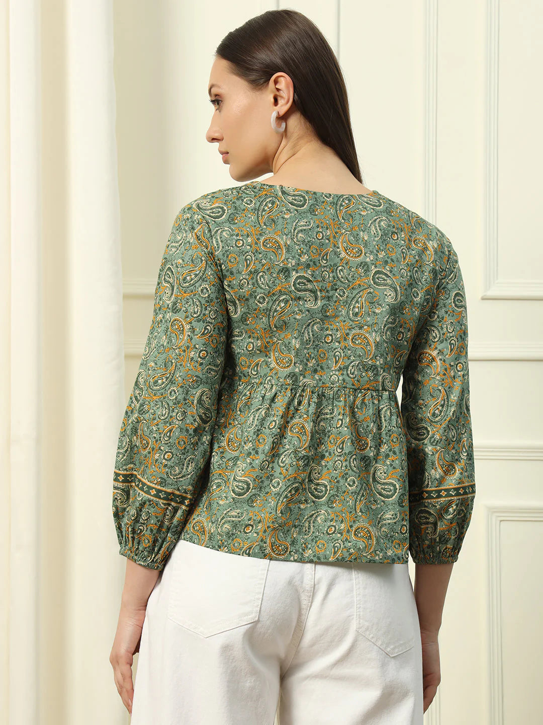 This stylish crop top showcases detailed floral prints, a chic v-neckline, and three-quarter sleeves, making it a captivating addition that elevates any outfit in your collection.
