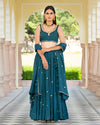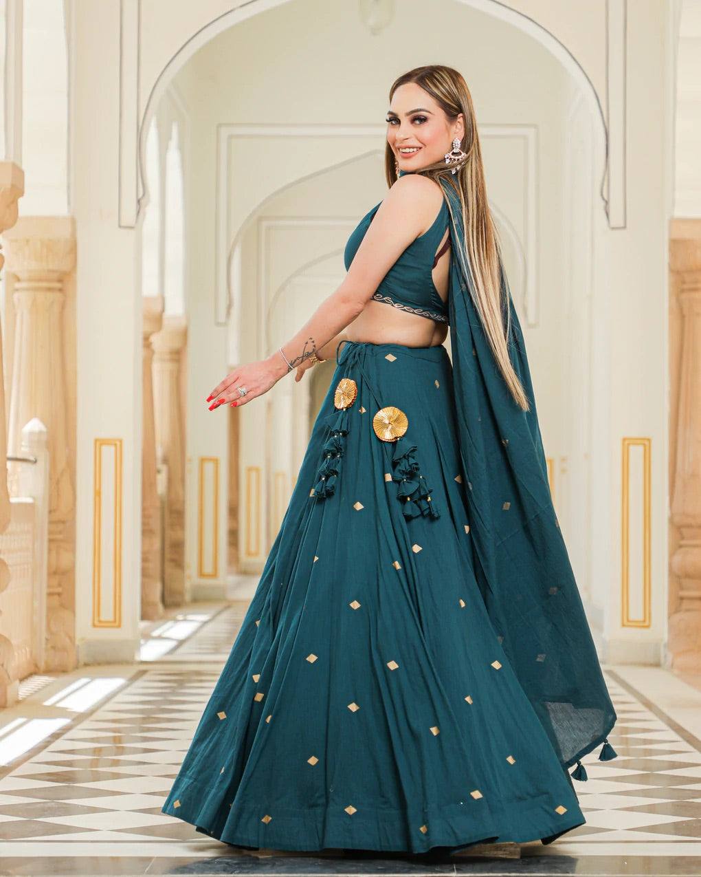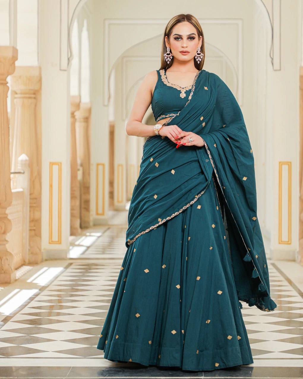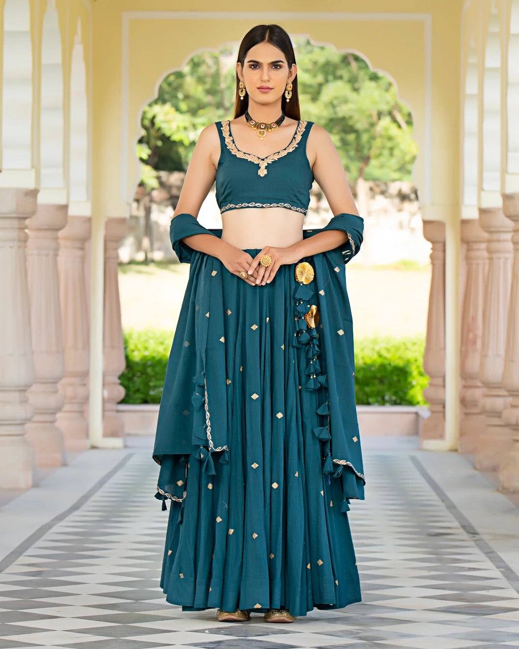 Ria fashions hosts a plethora of some of the best Indian lehengas online. We bring your our gorgeous embellished lehenga in a teal shade. The choli and dupatta are made in a beautiful mulmul fabric while the lehenga is made in silk. The choli and dupatta have minimal lace work done while the lehenga has been embellished in a stunning gold colour. This piece is perfect for parties, wedding ceremonies and festivals.