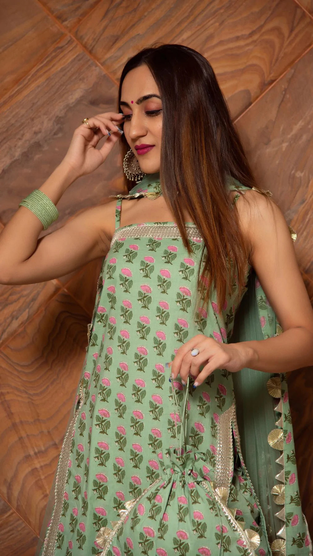 This is a beautiful 3 piece suit set.The set comes with a straight cut block print kurta has designer neck and calf length teamed with palazzo pants and a soft net dupatta to match.