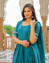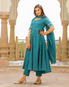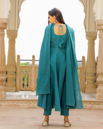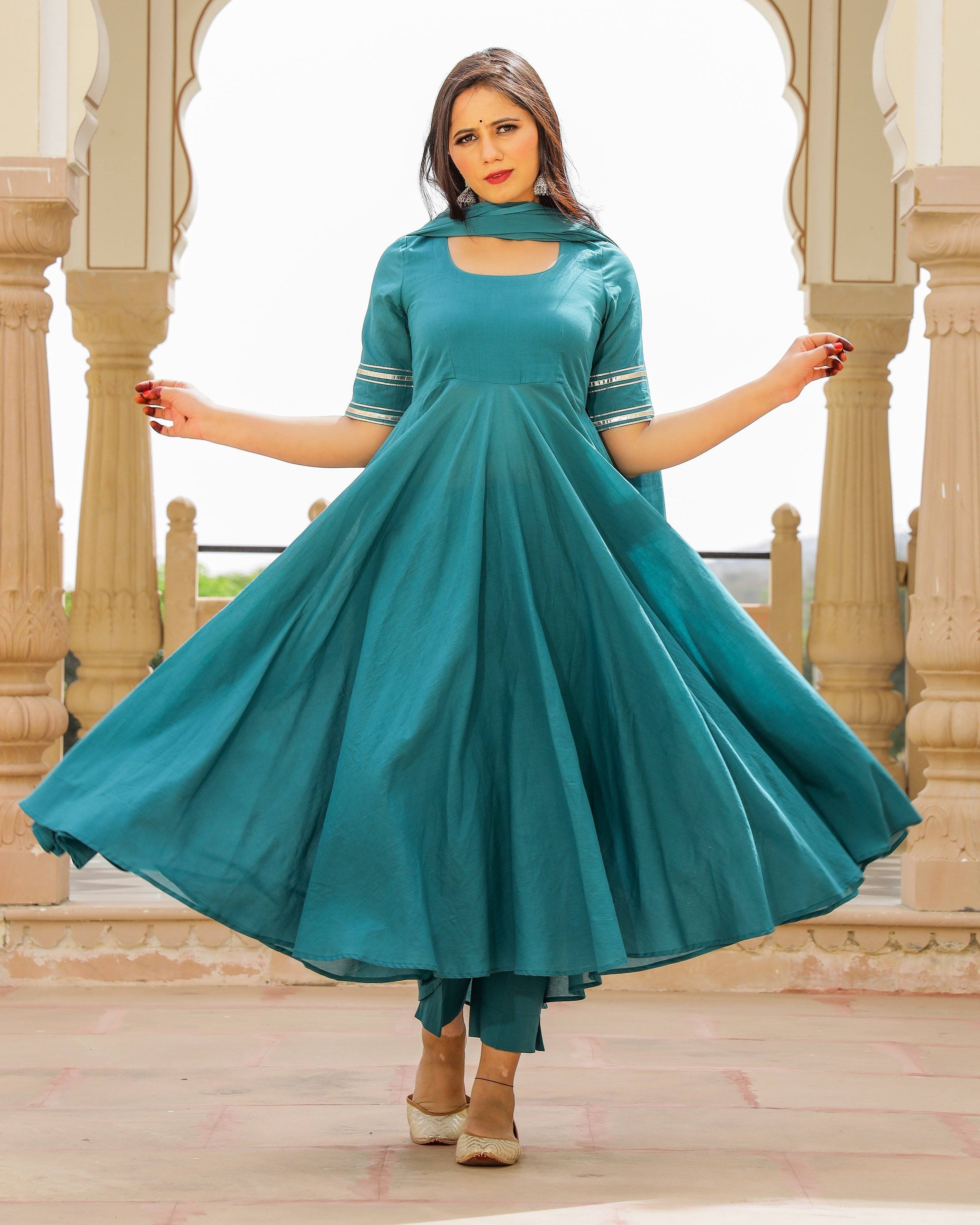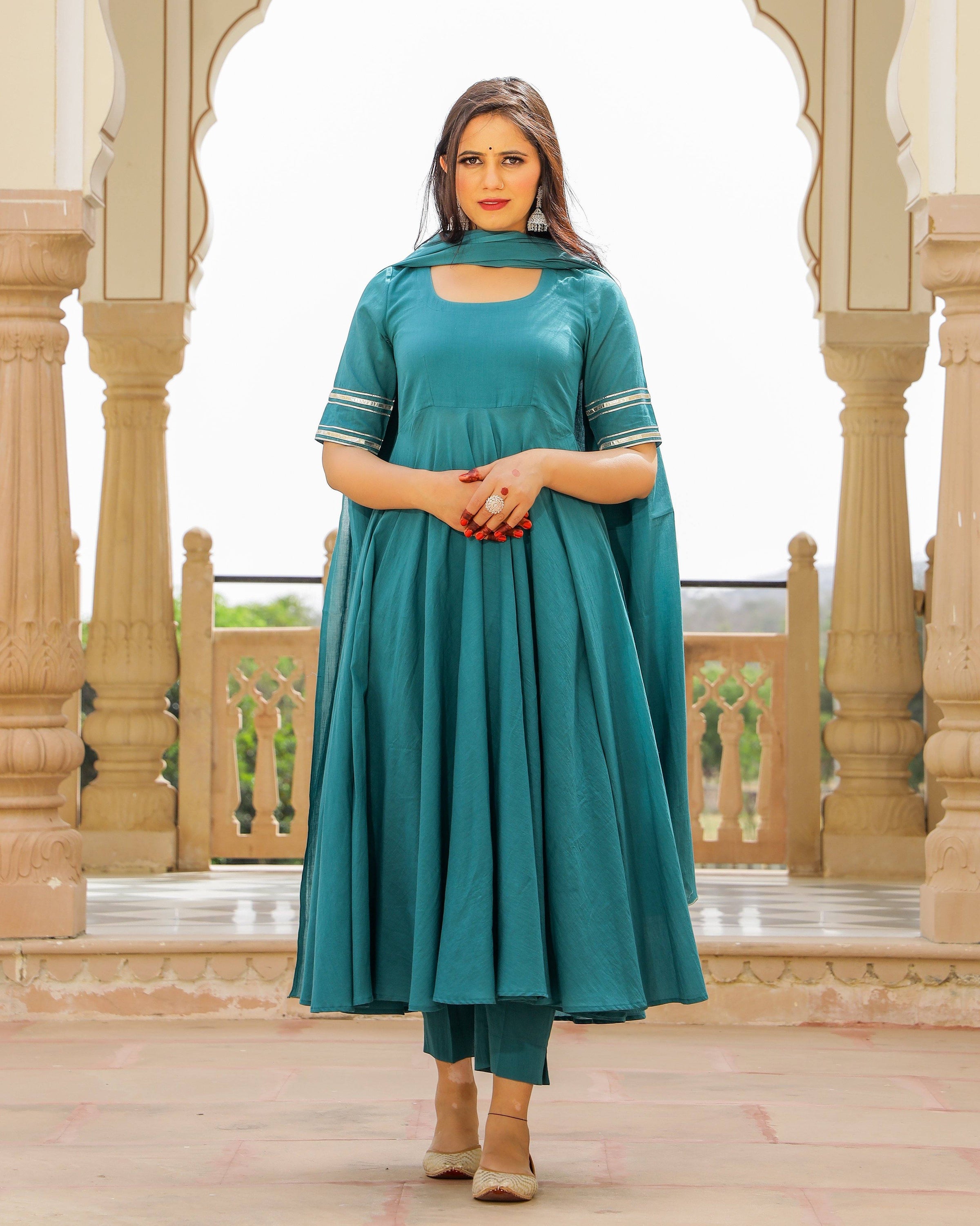 This 3 Pc kurta pant dupatta dress set is designed in solid cotton fabric with mul cotton Dupatta with gota on sleeves.