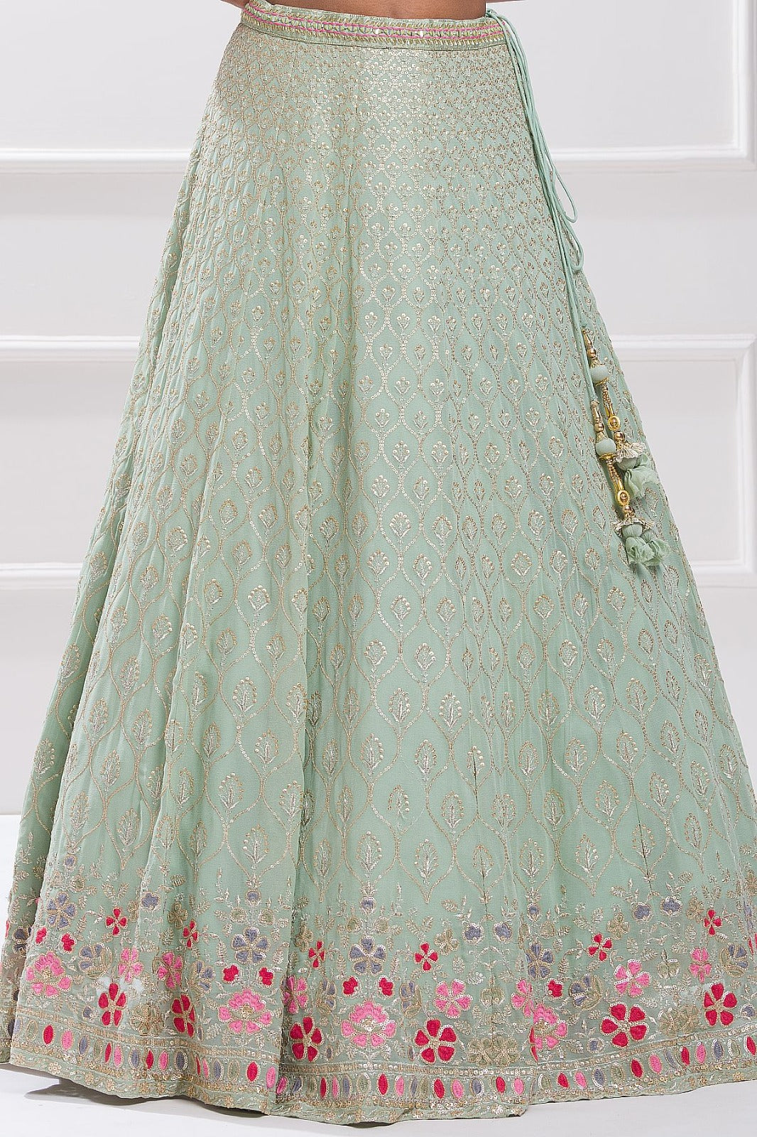 This light green georgette lehenga features elegant golden zari leaf patterns and vibrant floral embroidery with mirror and sequin details. The matching blouse has a flattering sweetheart neckline with colorful floral designs. A sheer net dupatta with golden embroidery and a floral border completes this graceful set, perfect for special occasions.