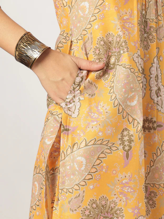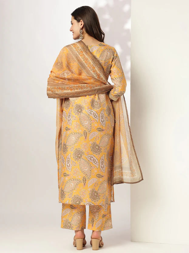 This mustard silk blend suit set features a straight kurta with a round-neck and delicate lace detailing. The vibrant floral print and practical side pocket add style and convenience. Paired with matching straight pants and a floral organza dupatta, it creates a graceful and complete outfit for any occasion.