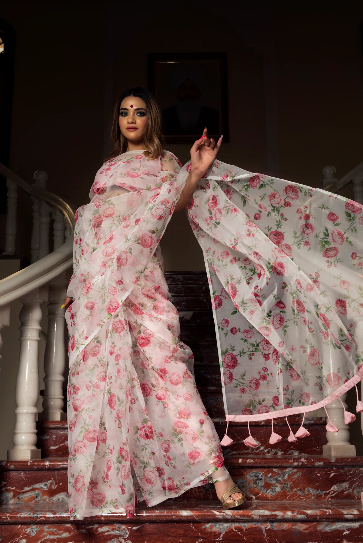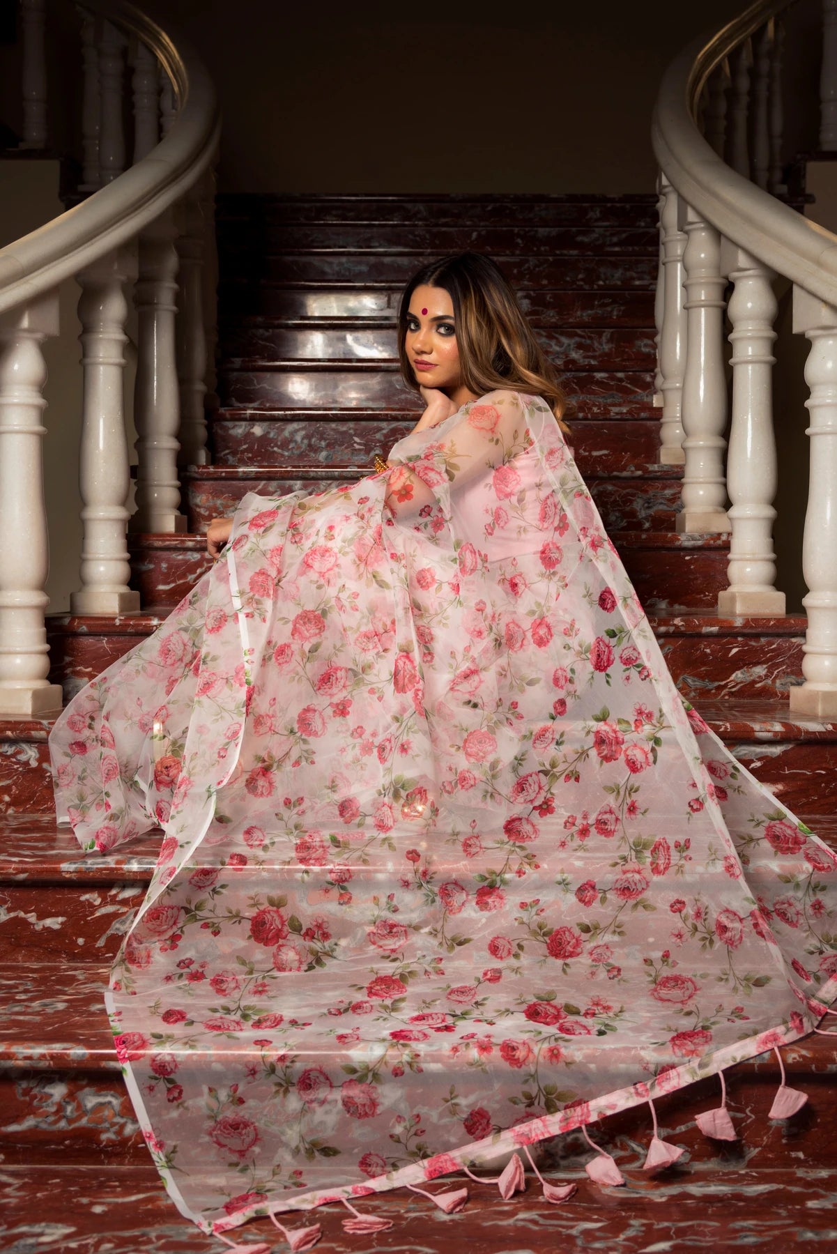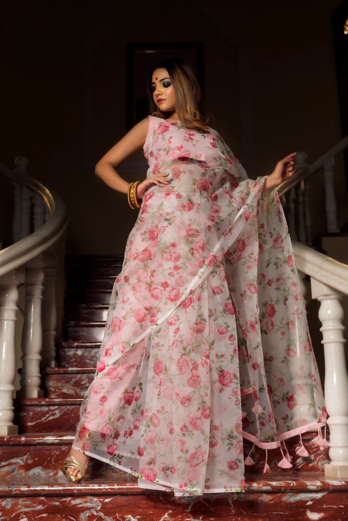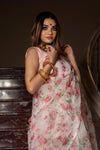 Grab this beautiful pink & white organza saree comes with unstitched blouse is perfect for any parties, event.The saree comes with floral print and lace detailing and 1 meter unstitched blouse.