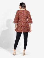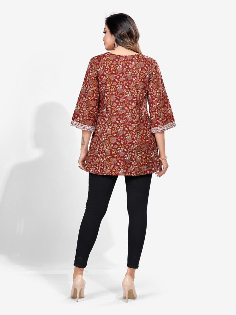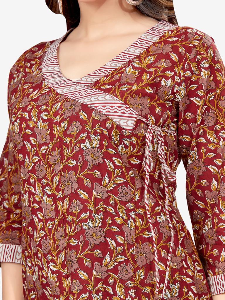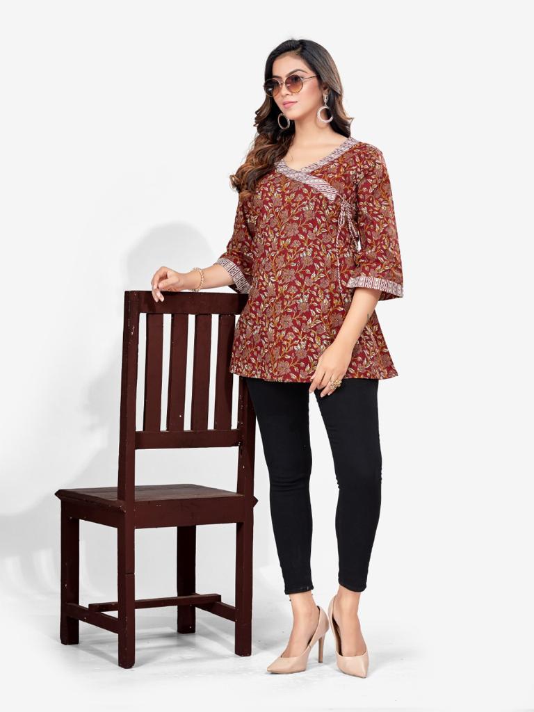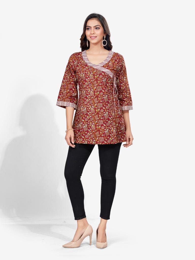 Kalamkari print angrakha style kurti features ,v- neck, three-quarter sleeves, straight hem,