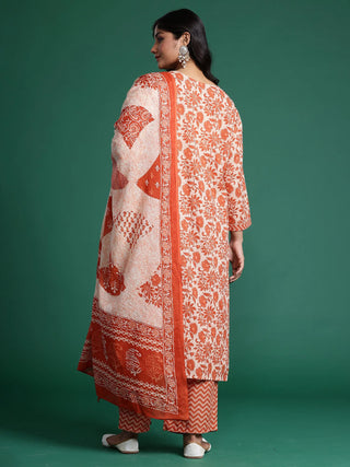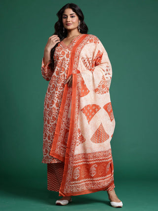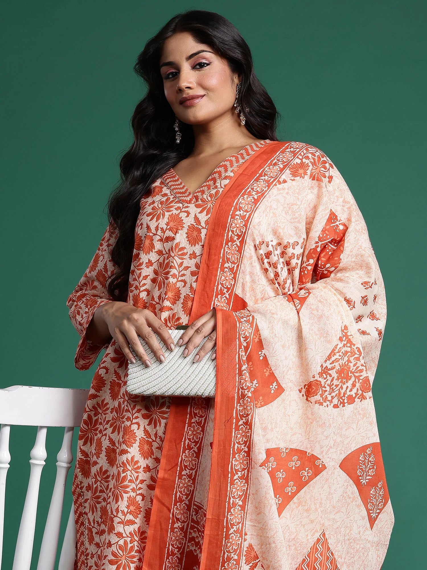 Experience timeless charm with this printed straight-cut kurta, designed with 3/4 sleeves and a stylish V-neck, falling gracefully to calf length. Paired with matching trousers featuring a cozy elastic waistband and a dupatta highlighted by a subtle tapping border, this suit set combines comfort and sophistication perfect for any event.