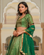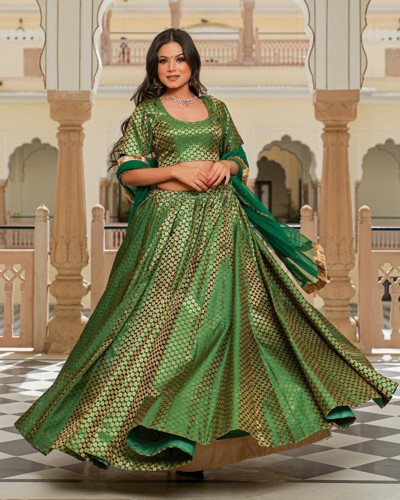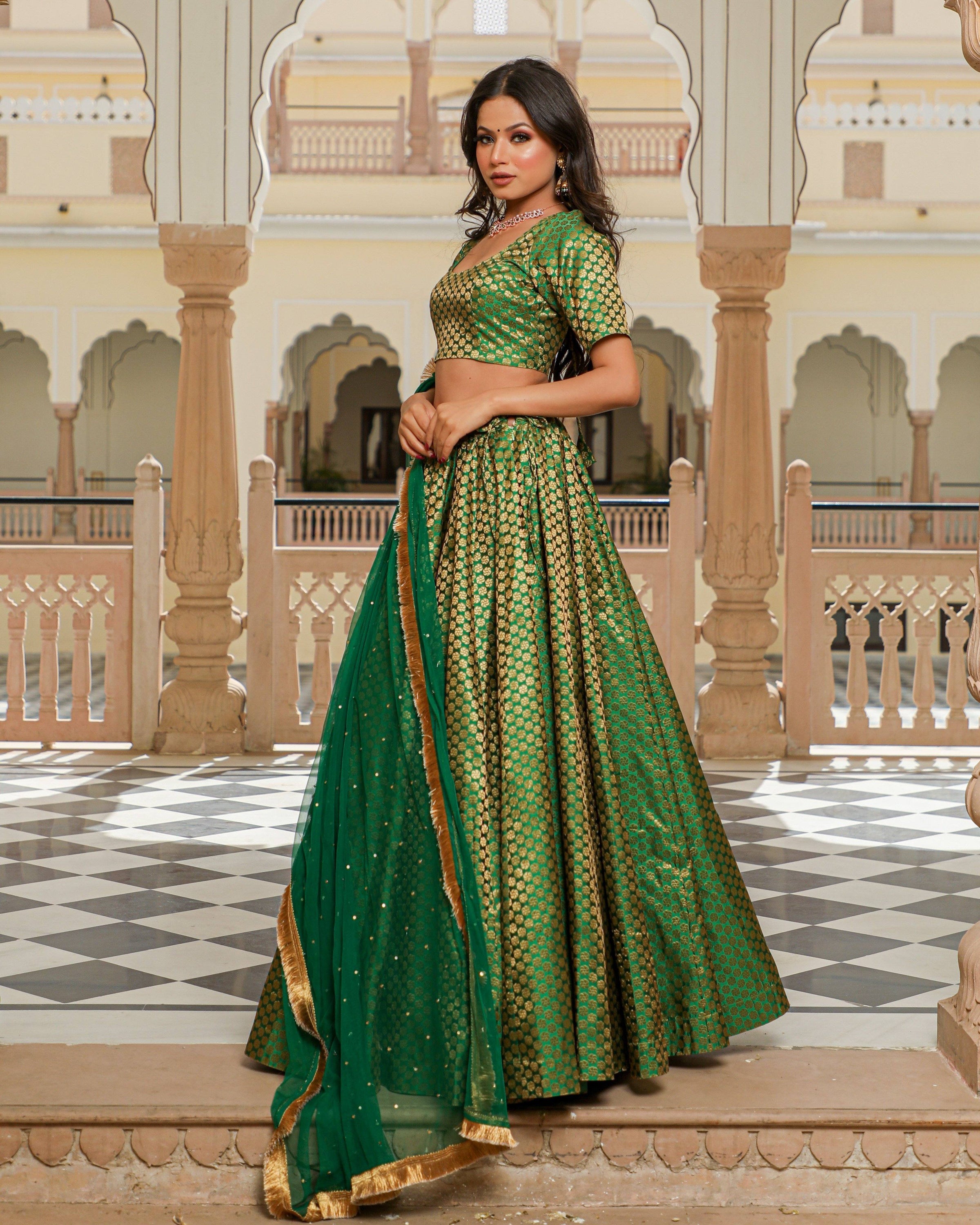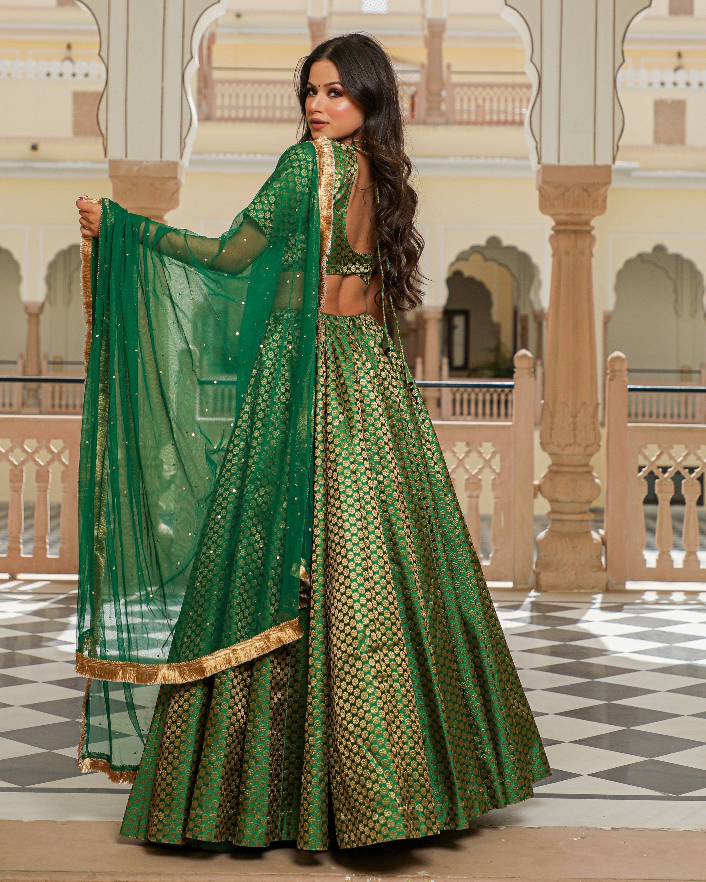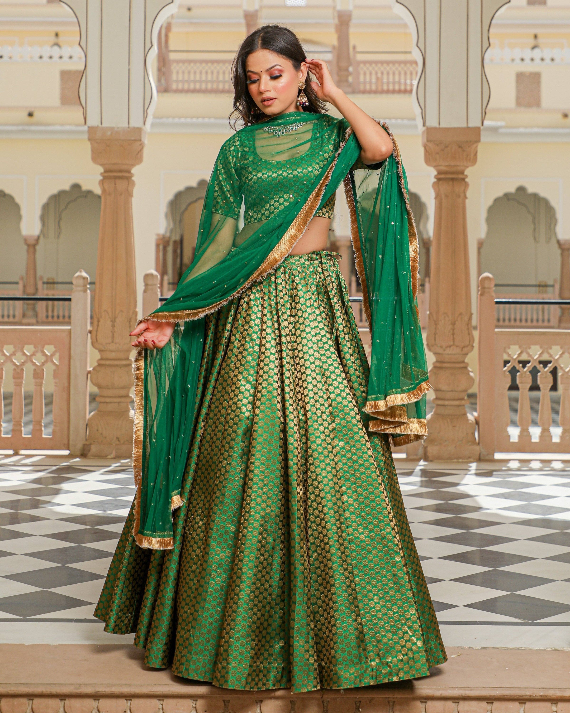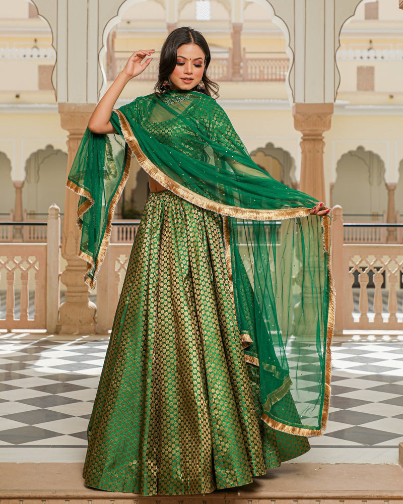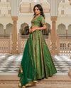 We can't get enough of this kalidar lehenga set with kanchali style choli! Flaunt the sitara handwork net dupatta and get ready to be the star of the evening. Don't forget to twirl!